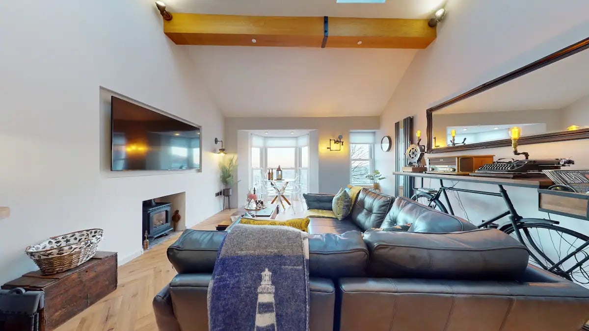 Your private suite is just 15 metres from the sea in our seafront home, with uninterrupted views across Swansea Bay. Step onto the new promenade or use the slipway opposite for swimming or paddleboarding. The space includes a king-size bed, large corner sofa (also a sofa bed), dining/work space, full-size fridge, and a modern shower room/WC. While there are no cooking facilities, the suite is equipped with cutlery, plates, bowls, and glasses, along with tea, coffee, and milk.