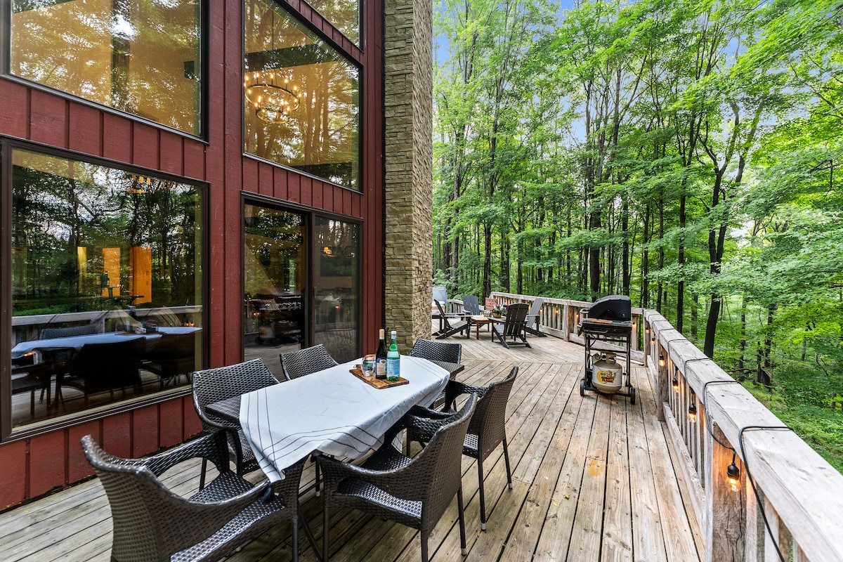 Located just two miles from the Village of Ellicottville, The Pines on Maples offers stunning views & a variety of amenities for relaxation and entertainment. Tucked away in the rolling hills of Western New York, this chalet features a large wood deck with a Weber grill & sitting area, as well as a walk-down path to an eight-person hot tub & an unilock fire pit with Adirondack chairs. State of the art Stuv indoor fireplace for cozy cabin days!!