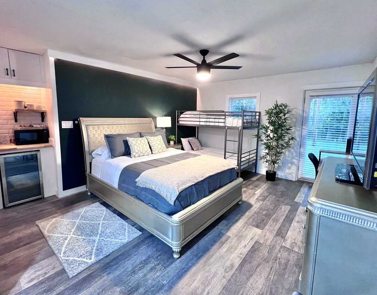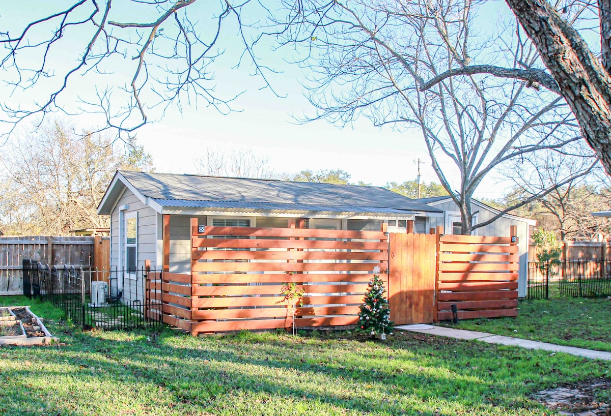 Welcome to your peaceful and private studio apartment. This Austin themed retreat features a comfortable Queen-size bed, twin pull-out sofa, small kitchenette, keurig coffee maker, mini fridge, and convenient portable convection cooktop; walk-in shower and a front porch as well. Enjoy the private entrance and separate side yard area, ideal for pets and relaxing in this calm and quiet space. Please note there is no separate bedroom, ideal for the 1-2 people-3 max. Extra fee more than 3 guests.