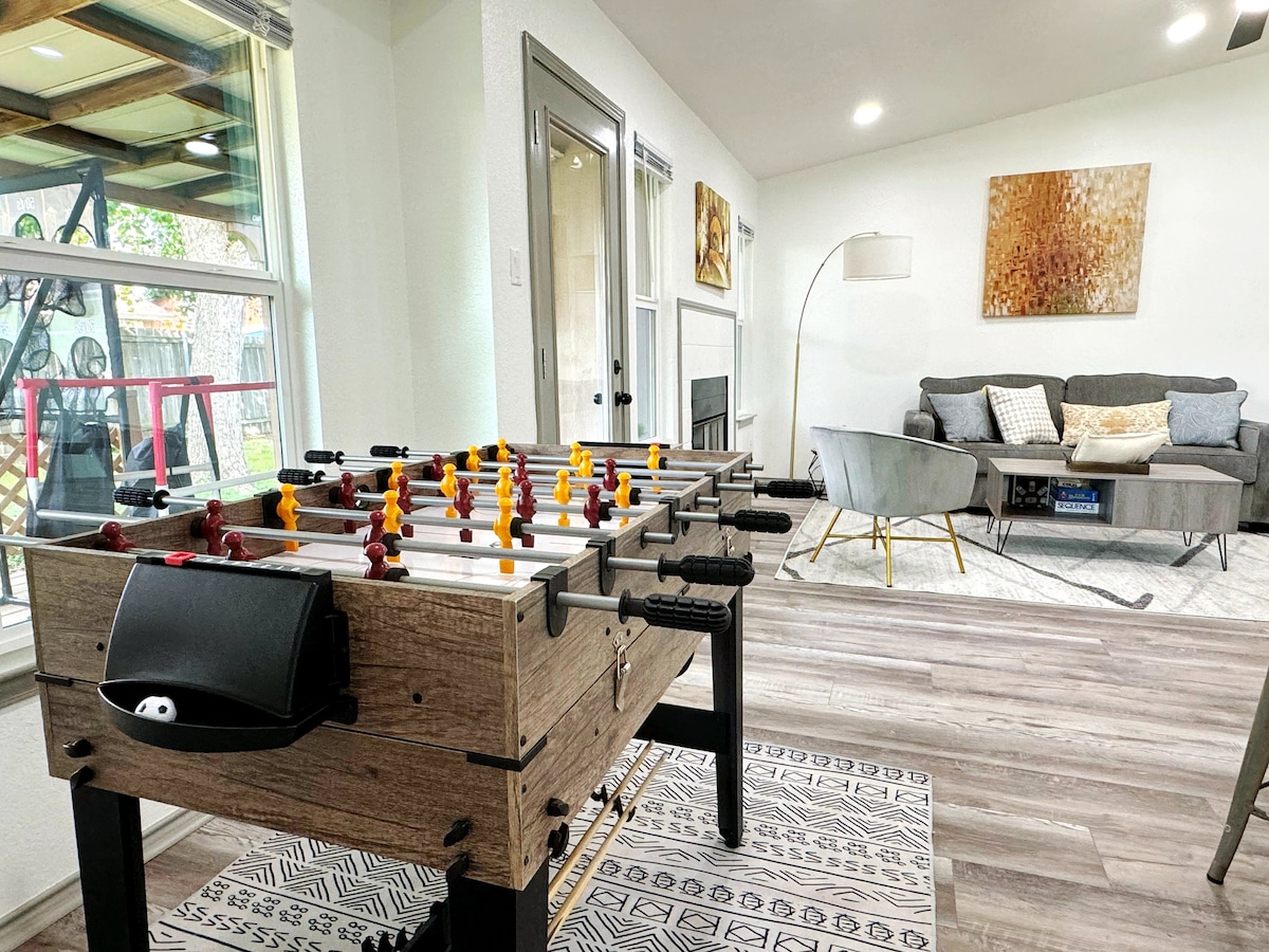 Bring the whole family to this modern living place with lots of room for fun; explore the rich life in central Cedar Park with minutes away access to all sorts of activities. Massive 2000 sqft of space with 3 bedrooms and 2 full bathrooms are all for you: 65" TV with free Netflix, high speed WiFi, foosball table, game table, convertible sofa bed, illuminated countertop, huge and quiet backyard... minutes away from shopping malls, and close to Tesla supercharger.