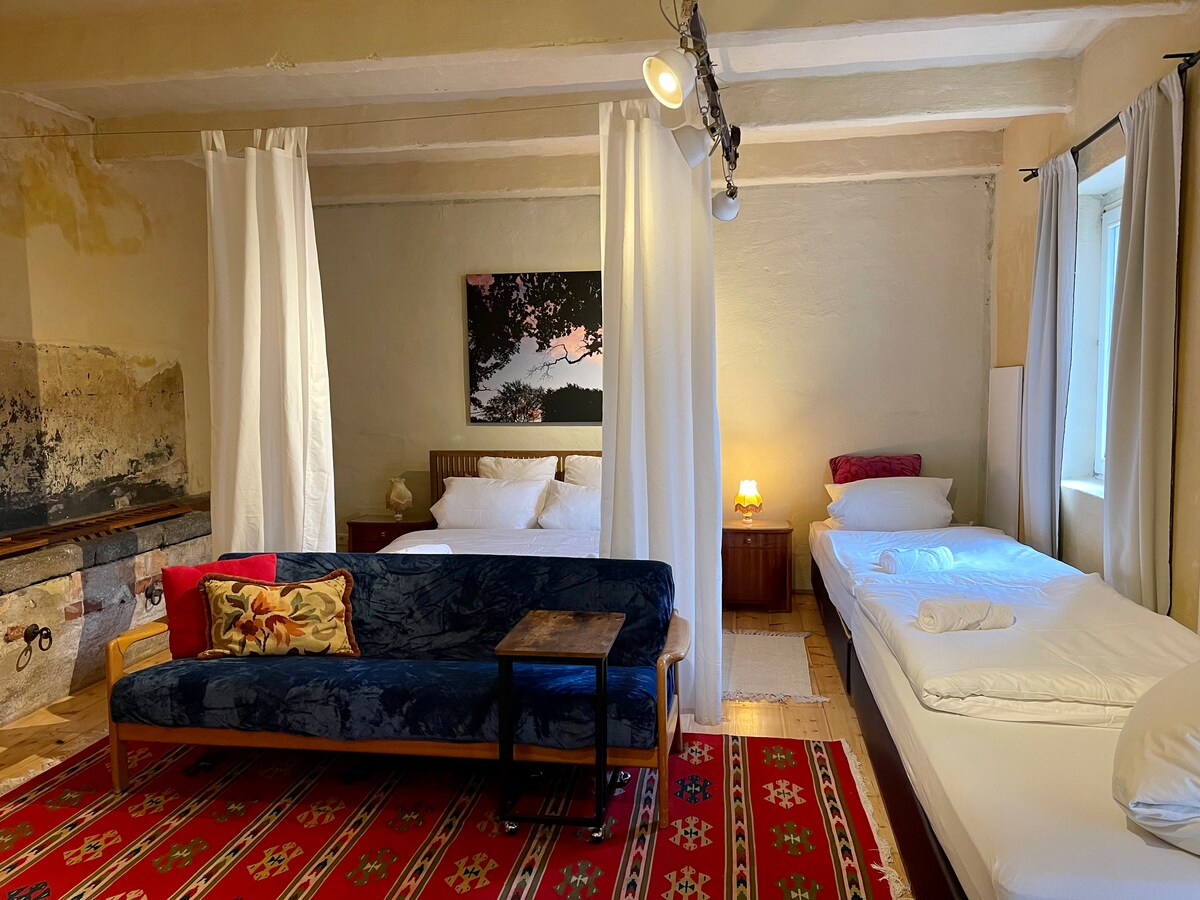 Cozy, rustic former stable on the ground floor: 1 living/dining room with kitchenette, WC/shower, 1 bedroom for up to 5 people with a queen-size bed (1.60x2.00m), 2 beds (0.90x2.00m), and single sofa bed (0.9x2m); terrace; courtyard; 250 MBit internet Wi-Fi; 30 min to BER and Main Station, 10 min to Ostkreuz and U5 “Sightseeing Line” (Main Station, Brandenburg Gate, Museum Island, Alexanderplatz); free street parking. Smoking, alcohol, and drug use are prohibited on the entire property.