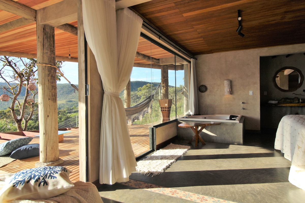 Integrante da romântica @VillaPousoAlto, a Gruta possui um espaço muito amplo (100m2 de área interna+varanda) e confortável para casal com uma vista ímpar das montanhas. Sua arquitetura mistura o rústico da chapada com sofisticação e modernidade, o que torna a estadia muito agradável e com muito conforto. Possui hidro, deck coberto, ar condicionado, TV 65", sound tower, piscina aquecida compartilhada com vista encantadora *CAFÉ DA MANHA OPCIONAL pago à parte @anahelenacafe. AGENDE na reserva