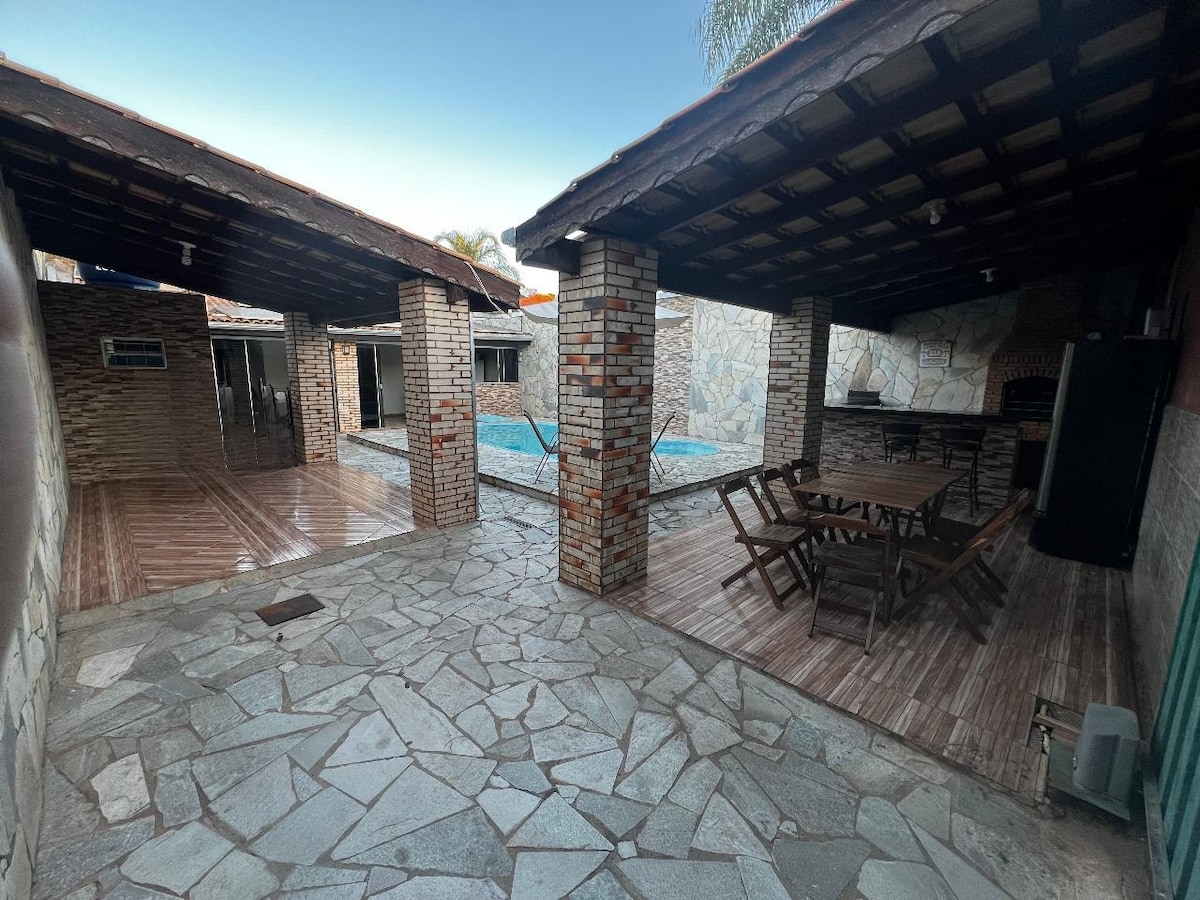 A casa é ótima para quem gosta de espaço e privacidade.Possui estacionamento Ar condicionado,internet.O quarto possui 01:cama de casal ,01 beliche e 01 de solteiro.Oferecemos aos hóspedes forros de cama e banho.Tem uma varanda ampla cozinha gourmet,fogão Cooktop,ducha externa,geladeira,forno elétrico 50 litros,liquidificador,sanduicheira grill, ferro de passar roupas.E todos utensílios necessários para o preparo dos alimentos e churrrasqueira,fica 5 minutos do centro da cidade,check in livre.