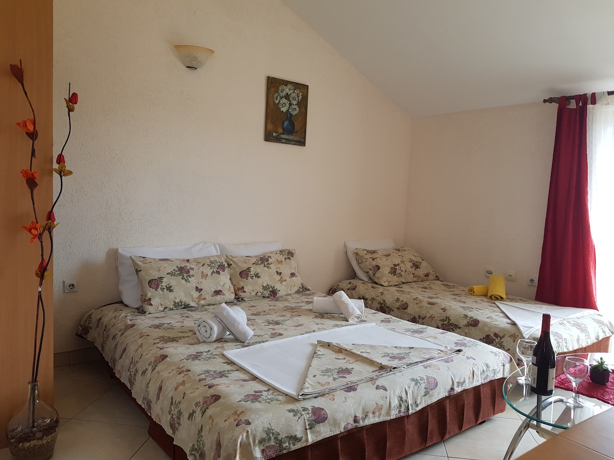 Bir otaqlı mənzilimiz dənizdən cəmi 2 dəqiqə(150 m), Budvada Slovenska çimərliyi və əsas promenaddan uzaqda yerləşir və terrasdan gözəl dəniz mənzərəsi var. Mənzil üçüncü mərtəbədədir. Burada 5 nəfər rahat yerləşə bilər. Mənzilimizdə tam təchiz olunmuş mətbəx, wi-fi, kabel televiziyası, kondisioner var... İllərdir icarəyə versək də, Airbnb-də ilk dəfədir ki, sizinlə görüşməyi səbirsizliklə gözləyirik!