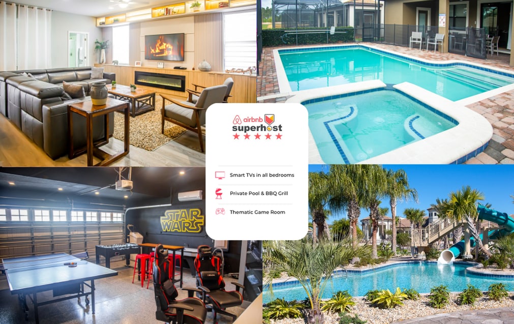 ***Is this home not available for your dates? We have more ! Simply click my profile and go to 'Nida's Listings' to see availability at the Ice Saber Manor! Would love to host you! :) Sky Lantern Manor is your dream Disney escape! With 3 luxe Master Suites and 3 themed kids’ rooms (Rapunzel, Moana & Avengers), plus a Star Wars theater, outdoor movies, karaoke, and a game room with Xbox & arcades, the fun never stops! Splash at the Oasis Club’s lazy river & slides or dive into the Retreat Club’s