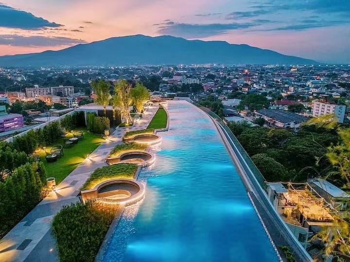 Chiangmai-də ən gözəl mənzil, möhtəşəm dağ və şəhər mənzərəsi olan möhtəşəm damlı üzgüçülük hovuzu olan Astra Sky River. binadakı bütün imkanlardan, üzgüçülük hovuzundan, saunadan, idman zalından, birgə iş yerindən və parkinqdən istifadə etmək pulsuzdur. Şəhərin mərkəzində, hava limanına avtomobillə təxminən 10 dəqiqə, köhnə şəhərə maşınla 5 dəqiqə, məşhur gecə bazarına piyada məsafə var. 1 dəqiqədən 7/11-ə qədər Astra是长康路上的五星级公寓,有非常漂亮的无边泳池,可以免费使用大厦里所有设施。 位置方便去任何地方,打车10分钟左右到机场,走路可去夜市,离塔佩门很近。