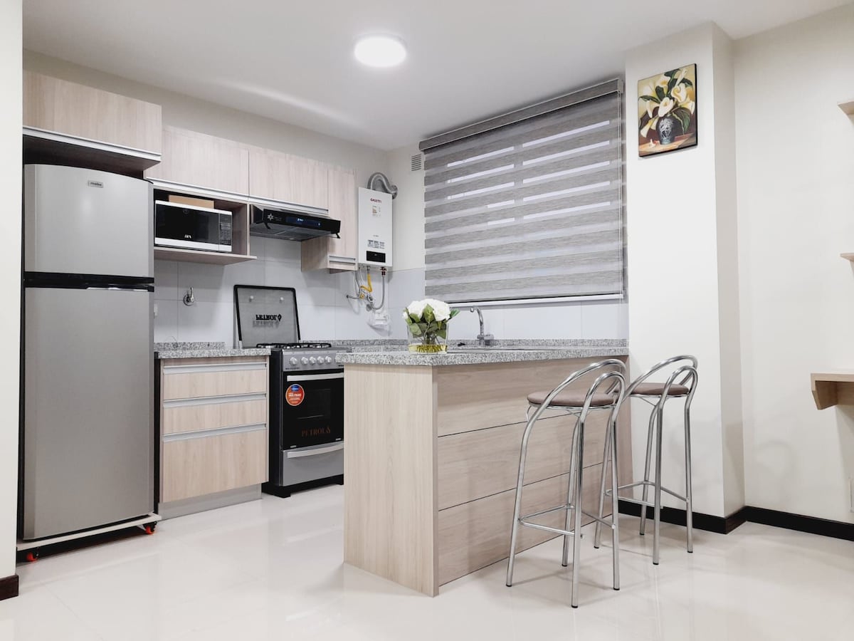 Rahat mənzil, cütlüklər və rəhbərlər üçün idealdır. Cochabamba ən yaxşı zonasında gözəl yeni binada yerləşir. Ərazi təhlükəsizdir və kafe, bar, restoran və kinoteatrlarla doludur. Bir neçə blokdan ibarət böyük supermarket və iki ticarət mərkəzi var.