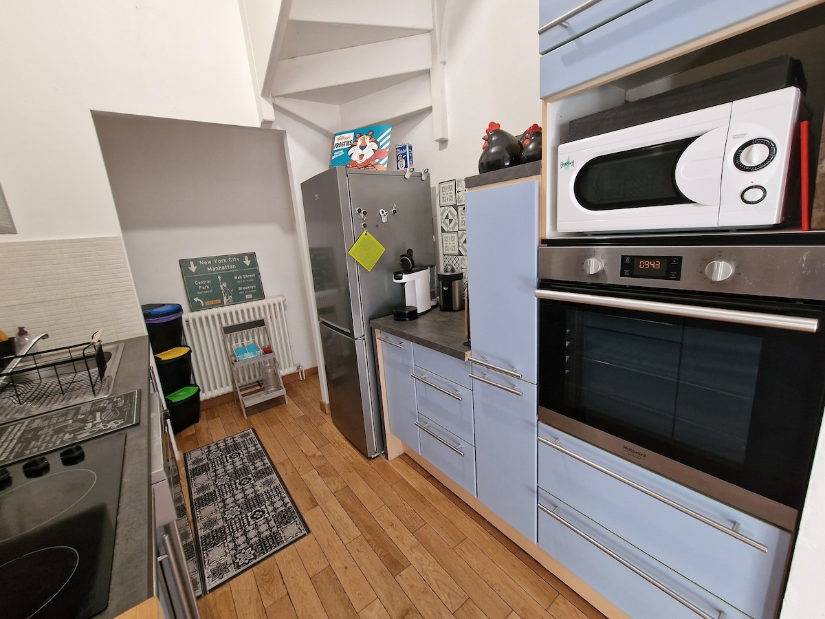 Loft cocon refait à neuf avec espace salon/cuisine ouvert, plafond cathédrale et mezzanine 🛌🏻Un coin nuit avec sa salle d'eau attenante. 🛌🏻Deuxième couchage en mezzanine linge de lit et serviettes fourni - Terrasse, pergola et jardin pour vous détendre au soleil (transats) - Coffee-thé pour vos petits-déjeuners - Cuisine toute équipée pour concocter de bons mets Le loft est situé au niveau des remparts, l’accès au centre se fait facilement Stationnement gratuit privé