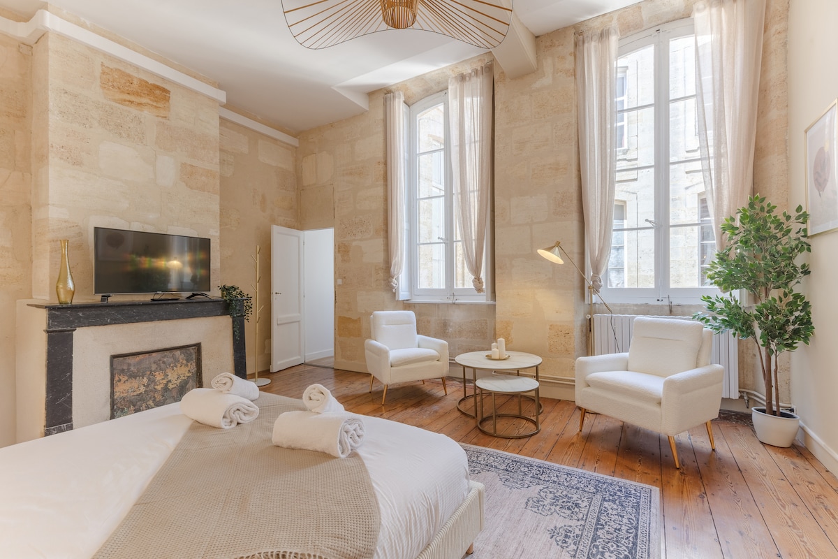 95 m2-lik ikimərtəbəli mənzil, imtiyazlı mövqe, nüfuzlu küçədə, birbaşa "Jardin Public"ə baxan rahat və dəbli bir ev bazasıdır. Mənzil üçüncü mərtəbədədir, lift var, bina 18-ci əsrdəndir. Aşağı mərtəbədə qonaq otağı və mətbəx. Üst mərtəbədə iki yataq otağı. Hər mərtəbədə duş və tualet olan hamam otaqları. Dekorasiya ənənəvi Bordo daş divarları müasir üslubla uyğunlaşdırır.
