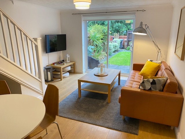 This Townhouse is located in a quiet Cul-De-Sac across from a park and parking space in front of the property. Your home away from home within a short walk into Manchester city centre. Spacious Living room, bedroom and separate Kitchen. South-facing garden & private parking space immediately outside the house. The large bedroom with a King size bed is located upstairs. There is a full bath and power shower. Gas Central Heating. There is also a dedicated office space.