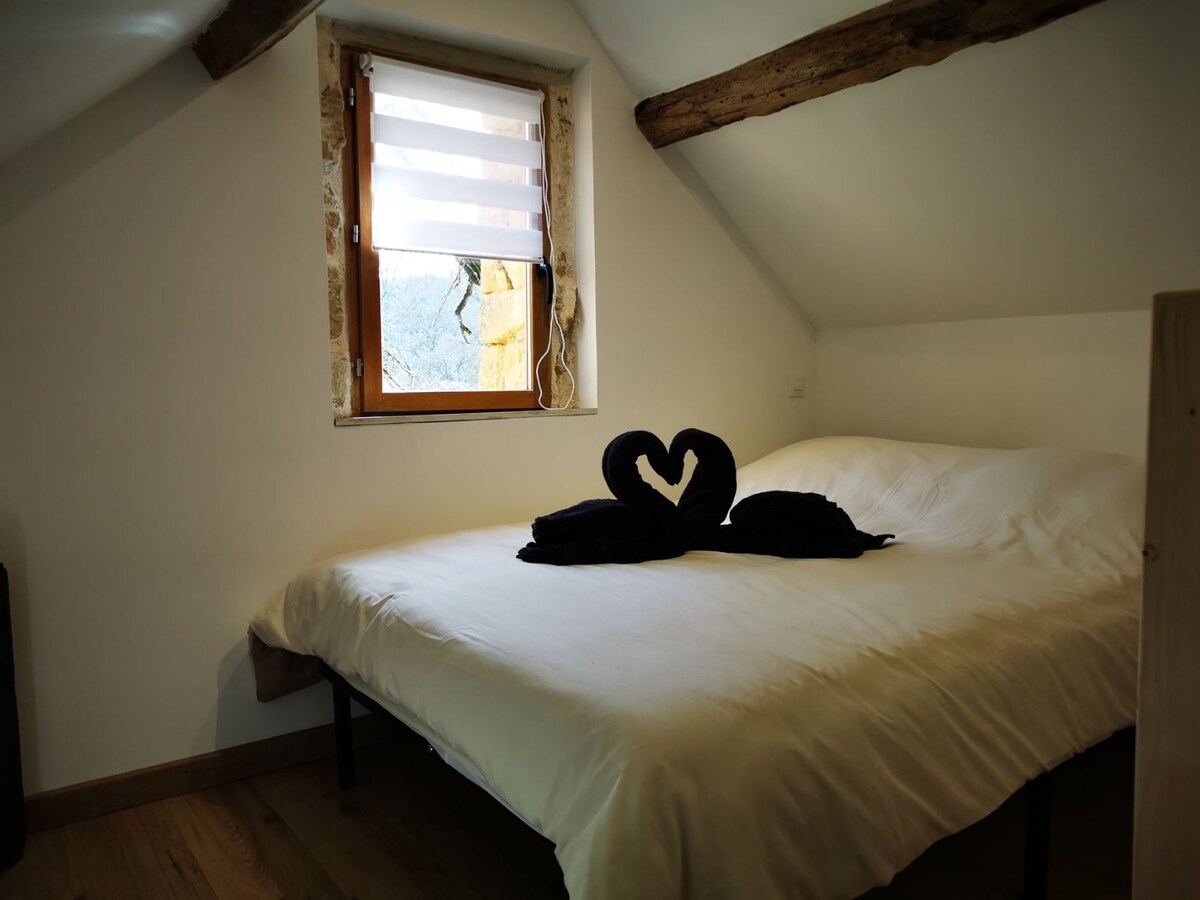Qəsrin ərazisində müstəqil girişi və bağı olan kiçik ev. Birinci mərtəbədə: Təchiz olunmuş açıq mətbəxi, odun sobası olan qonaq otağı. Duş otağı. Tualeti ayırın. Yataq otağı 2 birnəfərlik çarpayı. Yuxarı mərtəbələr (dar spiral pilləkənə diqqət yetirin): 160 sm-lik çarpayısı olan yataq otağı. Avadanlıq: wi-fi, qabyuyan maşın, paltaryuyan maşın. Döşəkağılar və dəsmallar təmin edilir. Mebel və barbekü ilə bağ. 1 km məsafədə Auvezère kənarında təşkil edilmiş giriş imkanı.