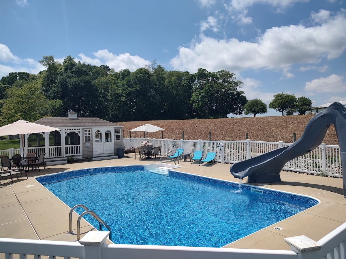 Large solar heated pool for summer fun! Relax and enjoy the peaceful surroundings on one acre at the end of a cul-de-sac. Cozy little suite with a large yard. Private space all to yourself, with parking and seperate entrance. AC, queen bed, foldout couch, microwave, Keurig coffee, large Air fryer, hot plate and mini fridge. There is a bathroom with necessary toiletries, sink and large walk in shower. If you like, Amish style sticky bread and/or fruit and juice will be provided for breakfast.