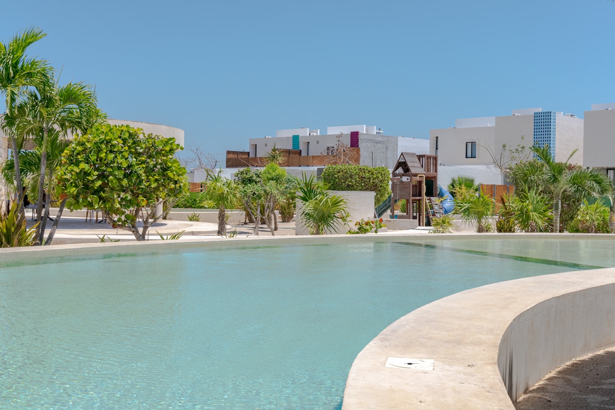 Çiksulub Puerto-da okeandan cəmi 6 dəqiqəlik piyada məsafədə müasir çimərlik evi! Özəl hamamları olan 4 yataq otağı, tam təchiz olunmuş mətbəx, özəl hovuz və sürətli WiFi – uzaqdan iş üçün idealdır. Hovuz, idman zalı, qum futbolu meydançası və gün batımı mənzərəli göyərtəsi olan qapalı icmada yerləşir. Sakit, komfortlu və hər şeyə yaxın, Puerto Proqresodan cəmi 7 dəq uzaqda!