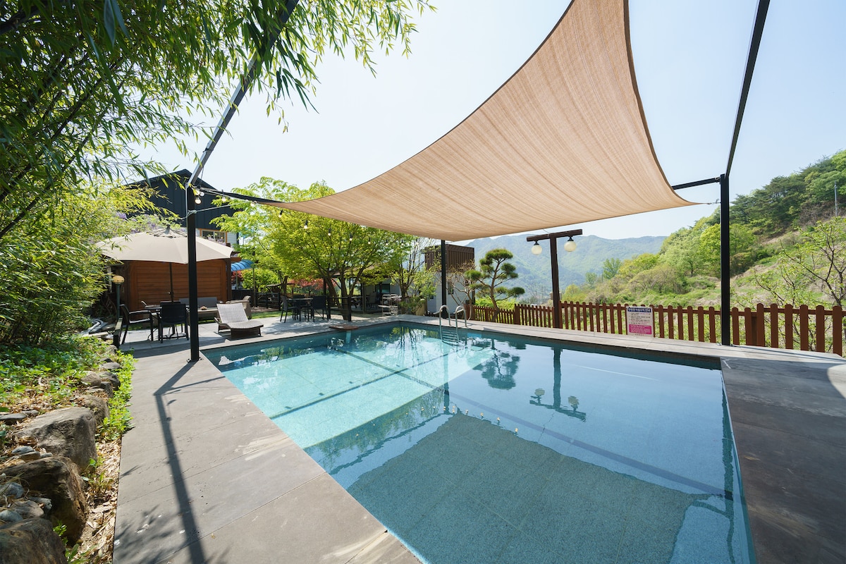 Bu, müxtəlif dəri xəstəliklərinə səbəb olan hexaval xrom və ətraf mühit daşları olan heç bir betondan istifadə etməyən, lakin yalnız hinoki ağ sidr çarpayıları və təmiz ekoloji təmiz materiallardan istifadə etməyən bir binadır. Bu, yalnız mənim üçün bir məkandır. Burada bədəninizi və geniş həyətdə tam istirahət edə bilərsiniz. Orientin ən böyük rəsədxanası olan Bohyunsan zirvəsini görə biləcəyiniz bir yerdə yerləşir, buna görə də hava aydın olduqda ulduzlar gecə tökülür və evin ətrafındakı Banqa dağının bitkiləri payızda möhtəşəmdir. Yelkənli dağ yolları narahatdır və televiziya yoxdur, lakin dağların sakit səsləri, təmiz hava və soyuq gecənin ulduzları və ay işığı burada qarşılanır. Şəhərin nə geridə qaldığını qaçırmayan və qeyri-müəyyən müddətə istirahət etmək istəyənləri salamlayırıq. Aktiv fəaliyyətlərdən və ya rəqsdən zövq almaq istəyənlərdənsə, şəhər həyatının tükənməsindən sağalmaq istəyənlər üçün tövsiyə olunur. Qonaqlama hər zaman dezinfeksiya edilir. (Ətraf Mühit Nazirliyi tərəfindən təsdiq edilmiş dezinfeksiyaedici MD-125)