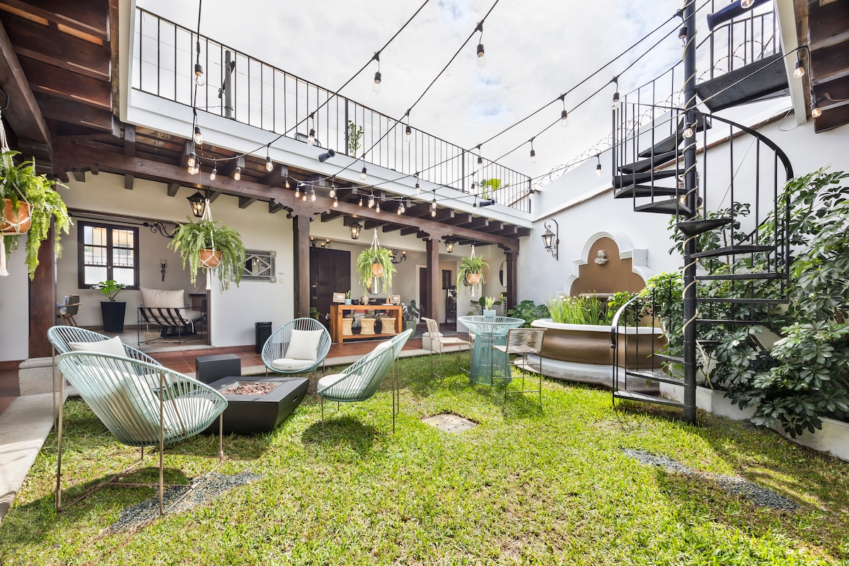Nəfəskəsici vulkan mənzərələri təklif edən geniş 3 otaqlı, 5 1/2 otaqlı evimizdə lüks və sakitlikdən zövq alın. 10 nəfərə qədər qonağı rahat yerləşdirən bu tarixi 300 yaşlı evdə orijinal cazibədarlıq, ispan terrası və həm qapalı, həm də açıq bağlar var. Buxarı ilə rahatlayın və mərkəzi parkdan cəmi iki blok və mercado de Artesanias-dan bir blok aralıda yerləşən unikal təcrübəni əlaqələndirin. Unudulmaz tətiliniz sizi gözləyir - qonaqlamanızı indi bron edin!