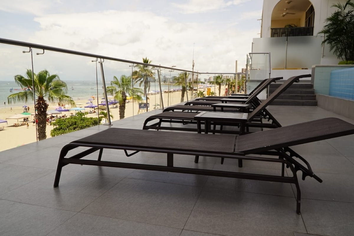 Ekvadorun ən təhlükəsiz çimərliyində, ÇİPİPƏ-də, dəniz kənarında, 4-cü mərtəbədə yerləşən 160 kvadratmetrlik böyük mənzil, kondisionerli 4 yataq otağı, 4 yeni hamam otağı, qonaq otağı, yemək otağı, mətbəx, camaşırxana, tam, tam təchiz olunmuş, qaraj, liftlər, çimərlikdə günəş üçün stullar, hər şeyə yaxın, kilsə, şokolad mağazası, omar, morro, mar bravo, restoranlar, kafelər, mağazalar, jetsky, banan, balinaları görmək üçün qayıq gəzintisi, veykbordinq və s. Yalnız kiçik ev heyvanlarına icazə verilir.