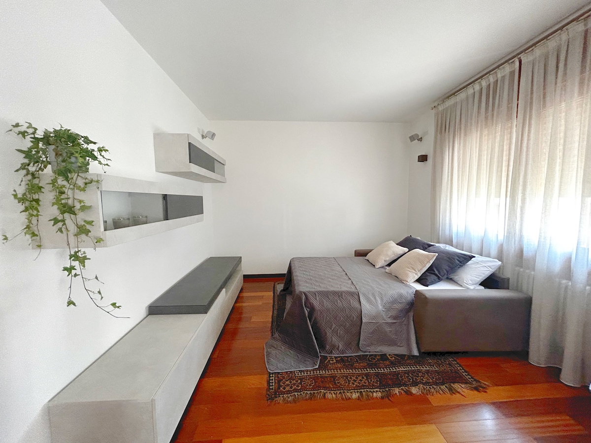 Bu, tam təchiz olunmuş mini-apartamentdir. Mətbəx/qonaq otağı və kiçik bir eyvan var. Yataq otağı genişdir, ayrıca hamam otağı, yeni ikinəfərlik çarpayı, böyük qarderob və divan var. Venesiya və Mestre qatar stansiyasına nəqliyyat çox yaxındır. Qiymətlərim gecəlik şəxslərə əsaslanır, çünki tək səyahət edənləri cəzalandırmağı sevmirəm, odur ki, düzgün sayda insan üçün bron edin. Öz-özünə giriş imkanımız var, lakin sənədinizi göstərmək üçün bir şəxslə görüşməyi üstün tutursunuzsa, əlavə xidmət haqqı ödəməlisiniz.