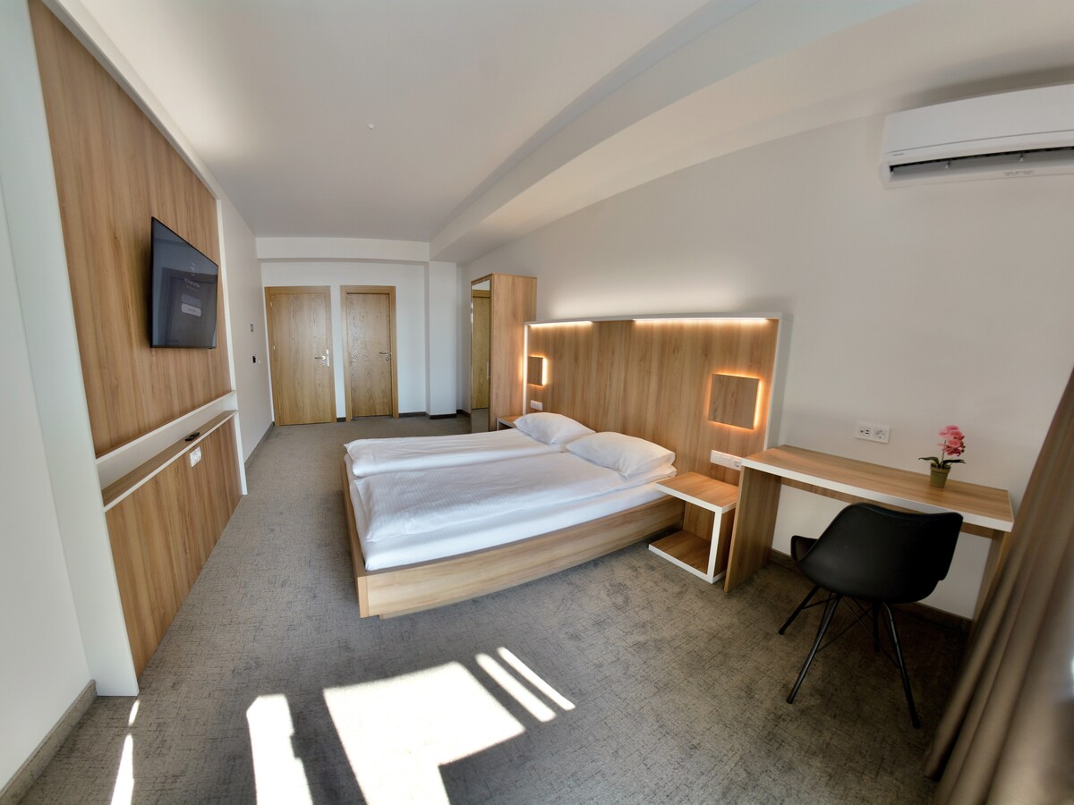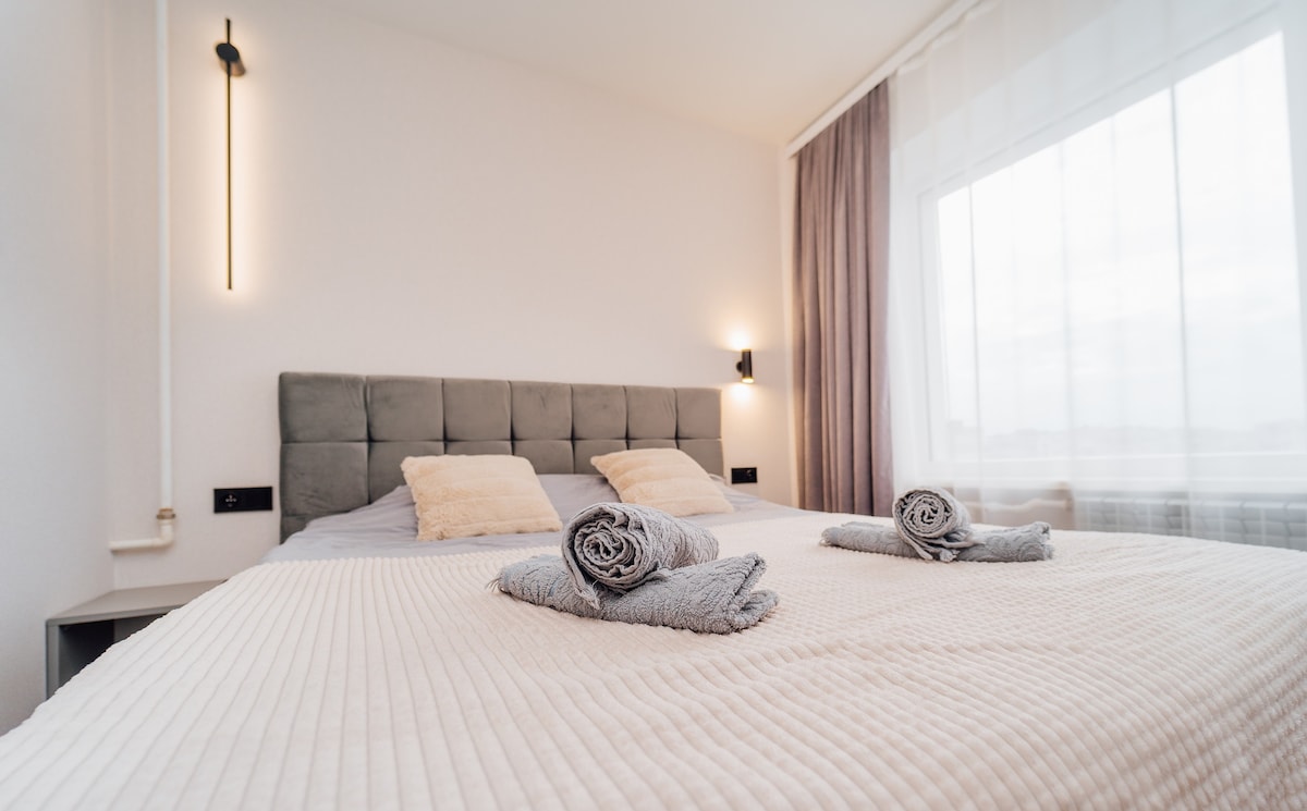 Kaufland və kafelərdən bir neçə addımlıq məsafədə dizayner 2 yataqlı mənzildə günəşin doğuş mənzərəsi ilə oyanın. 2 yataq otağı + divan-çarpayı otel səviyyəli yataq dəsti ilə 6 nəfərlik yataq yeri. Peşəkar mətbəxdə bişirin, Netflix və 300 Mbps Wi-Fi ilə dincəlin və ya avtomobilsiz həyət və oyun meydançasında gəzintiyə çıxın. Öz-özünə giriş, hər otaqda kondisioner, paltaryuyan/kurutma maşını və küçədə pulsuz parkinq. Ailələr, işgüzar səfərlər və ya uzunmüddətli qonaqlamalar üçün mükəmməldir.