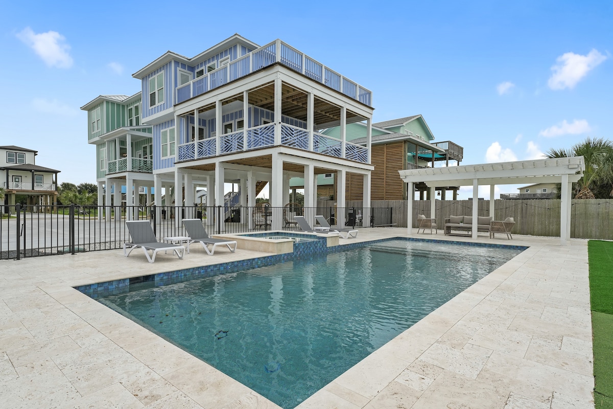 YENİ Çimərlikdə Tikinti! Həqiqətən Unicorn:🦄 MÖVQE, LÜKS və YENİ olmaq üçün çox gözəl! Sörfdə ən yaxşı restoran və çimərlikdən uzaqda yerləşir. Evin altındakı qamaklardan və oyunlardan zövq alın. San Luis Pass-dan Cettiyə qədər mənzərələri olan möhtəşəm kölgəli göyərtəyə doğru addımlarla qalxın! 180 dərəcədən çox maneəsiz baxış. Yataq otaqları SunDeck-ə açılır və video üçün yanğın 🔥 çuxuru YouTube Beachfront Luxe ilə ulduzları seyr edir $ 125 təmizlik haqqı və bütöv qonaqlama üçün maksimum 2 ev heyvanı üçün cəmi 75 $!