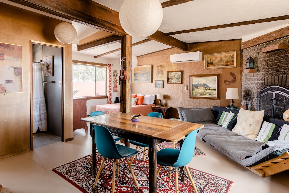 Spacious one bedroom cabin. Fashionably furnished. A Creative space that feels like stepping back in time and into the future. Full kitchen, Air Conditioning, Swamp Cooler, washer and dryer. Peaceful outside area to star gaze with fire pit. 3 Minutes to the entrance to Joshua Tree Natinonal Park. Great base camp for adventures into the National Park, getaway for couples or the loan wolf looking to channel his/ her inner genius. Vintage record player/ console with auxiliary input. No TV.