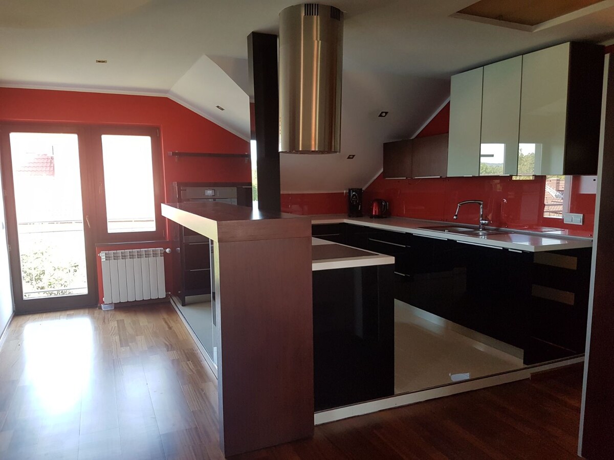 WHITE HOUSE White House invites you to its beautifully arranged space, inspired by the industrial, loft style. Stone, brick, wood and metal are main materials used in space combine. All apartment and furniture are custom design. Designed by famous silesian polish designer. Fiber WIFI. The loft apartment is located in a calm and quiet district of Dąbrowa Górnicza – Pogoria, close to lake and forest and is situated close to Katowice (20 km) and Katowice Airport (20 km).