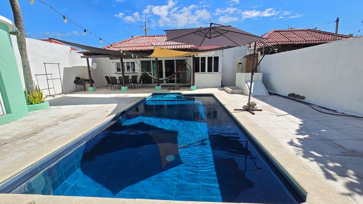 Casita tipo rancho minimalista (NO DE LUJO!) con cocinita y piscinita. Es cómoda con luz y ventilación natural, pérgola adyacente para relajarse frente a la piscina. Dormitorio con 2 camas Queen y y sala amplia, con 2 sofá camas incorporados. Perfecto para parejas, familias pequeñas o MAX 6 adultos. Excelente ubicación central en la parte hotelera, pero aislada para pasársela tranquilo. Bares/restaurantes a pocos pasos y una tiendita a 15 mtrs. A 1.5 cuadras de la playa.