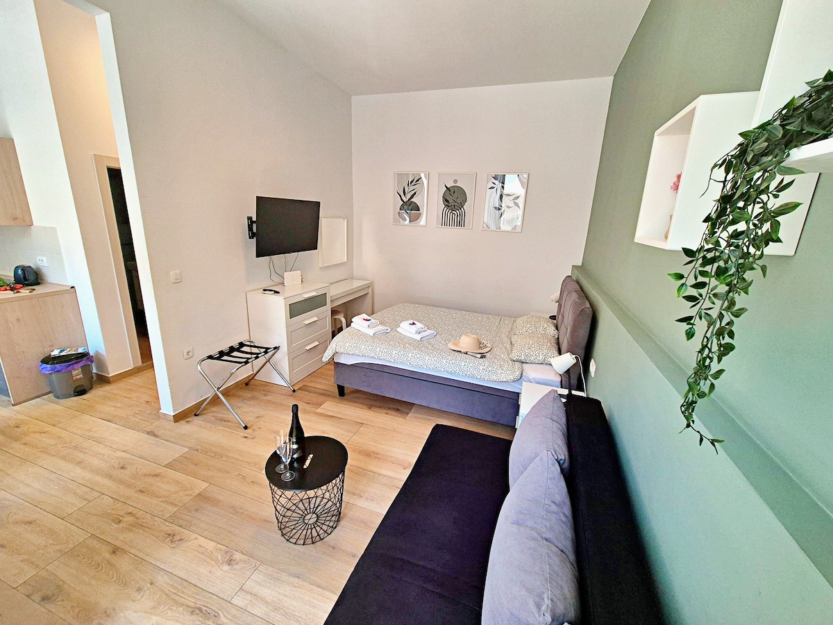 Bu müasir mənzilə tam (yemək yeyən) mətbəx, kombinə edilmiş yataq otağı və rahat açılan divanı olan qonaq otağı və bu yaxınlarda yenilənmiş hamam otağı daxildir. Mənzil birinci mərtəbədə yerləşir və tarixi şəhər mərkəzində yerləşir. Xüsusən də avtobusla gəldikləri halda cütlüklər üçün idealdır, çünki mərkəzi avtovağzaldan bir dəqiqəlik məsafədə yerləşir. Mənzil çox yaxşı təchiz olunub. Qabyuyan və paltaryuyan maşın mətbəxdə, televizor isə kondisionerli qonaq otağında yerləşir.