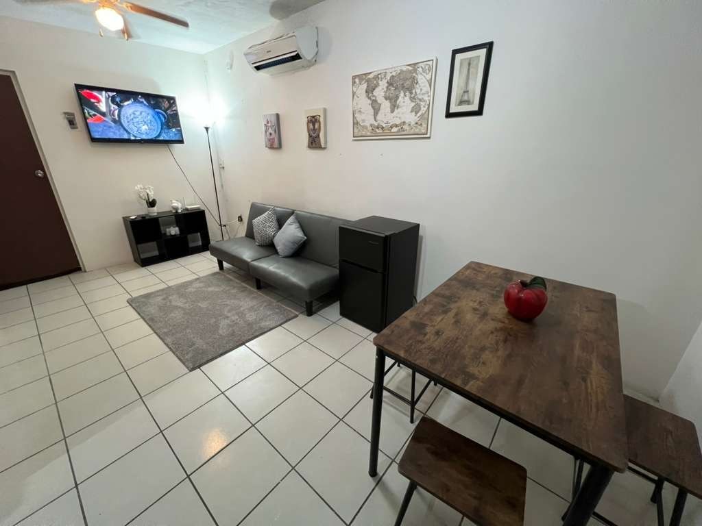 Disfruta de la sencillez de este alojamiento tranquilo y céntrico. • 2 habitaciones amplias con camas cómodas y pantallas para que disfrutes tu estancia • Sala acogedora con TV y WiFi gratuito • Cocinita equipada (refrigerador, estufa, microondas, utensilios) • Baño completo con agua caliente • Lavadora y secadora en el alojamiento • Aire acondicionado y buena iluminación natural