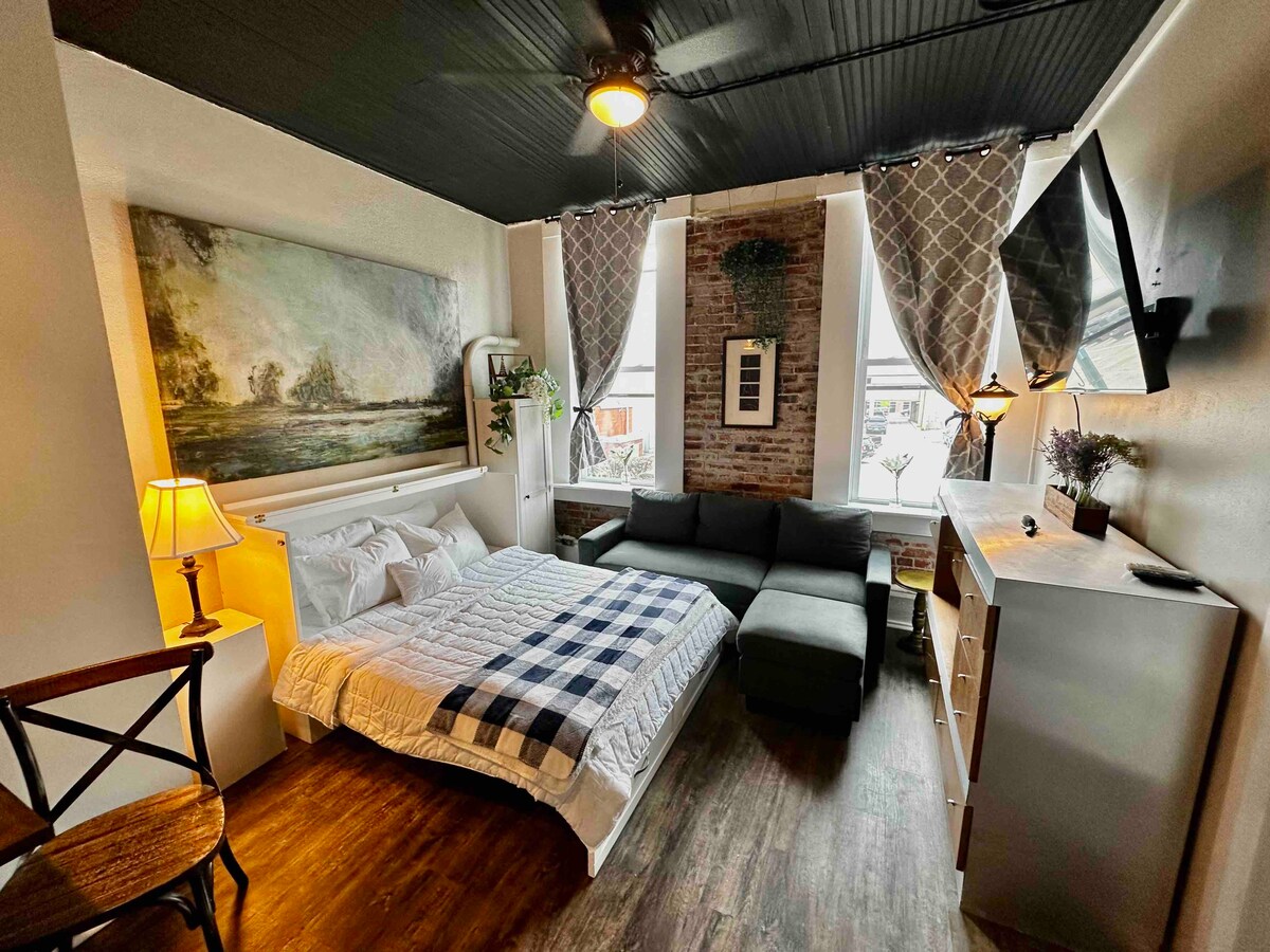 The allée des fraises loft is a studio loft inspired by my stay in Paris and London, located on the second floor of an historic 1890’s building. The charming brick walls and rustic aesthetics add character to this bright space. Perfect for a couple’s getaway or a solo traveler in town for work. Walking distance to coffee shops, restaurants, local cafes, boutiques, breweries and more. Near Austin Peay State University, Fort Campbell and less than hour from Nashville. A parking pass is provided.