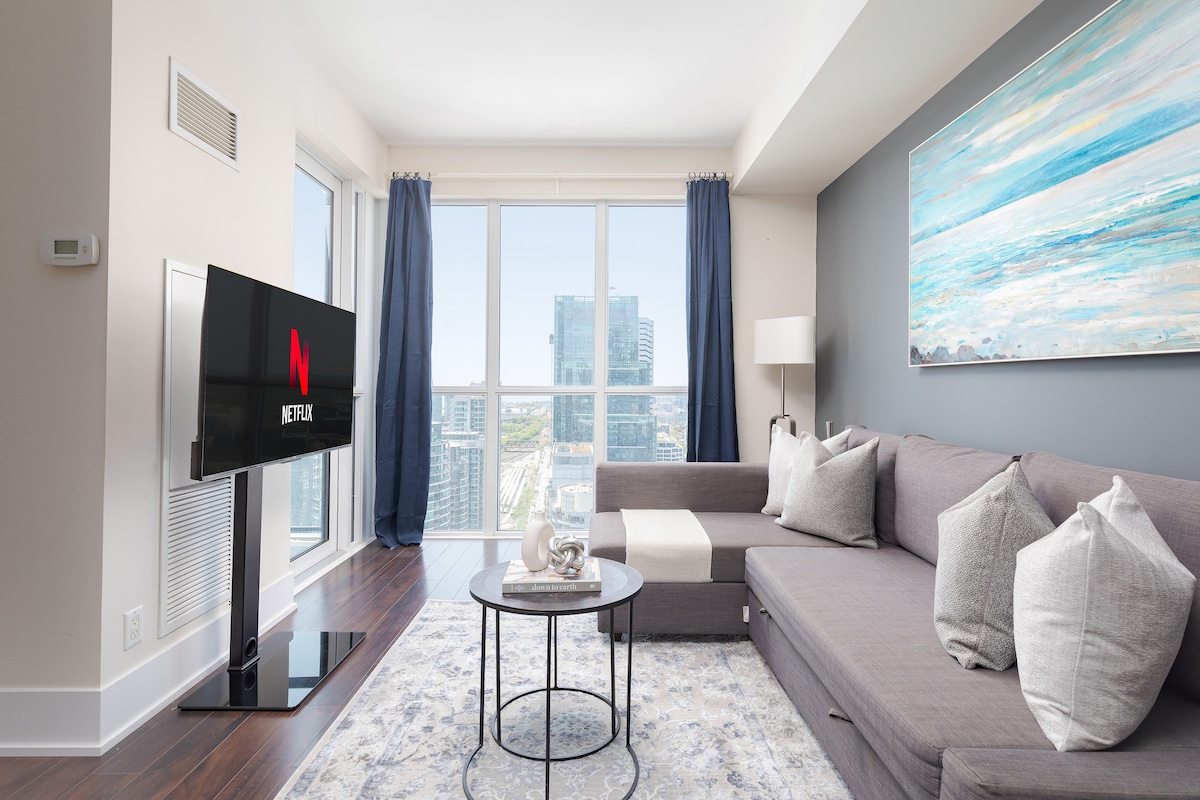 Enjoy a stylish experience at this centrally located condo. Our place is 5 minutes from the lake and amazing attractions such as Scotiabank Arena, Ripley's Aquarium, CN Tower, Rogers Centre and so much more. Just steps from Union Station and the underground PATH system. This condo is great for travellers, tourists and business trips. The Space Our condo is located on the 51st floor with Hi speed wi-fi, Smart TV with Netflix, toiletries, hair dryer, kettle, iron, washer/dryer and so much more.
