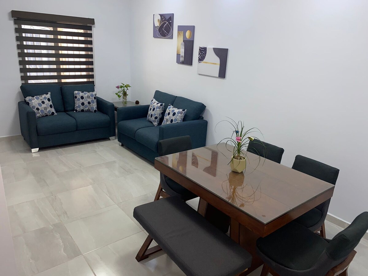 Nuevo Departamento a 5 mns caminando de IMSS, Laguna del Nainari y 5 mns en carro a ITSON. Cuenta con dos cuartos, uno con cama matrimonial y otro con cama matrimonial y cama individual, además de una sala con sillón en el cual puede dormir una persona. Baño completo, cocina equipada con estufa, microondas, refrigerador, sartenes, utensilios de cocina y todo lo necesario para una estadía agradable. Cochera, consultar disponibilidad. Cámaras de seguridad exteriores, jardín y patio exterior
