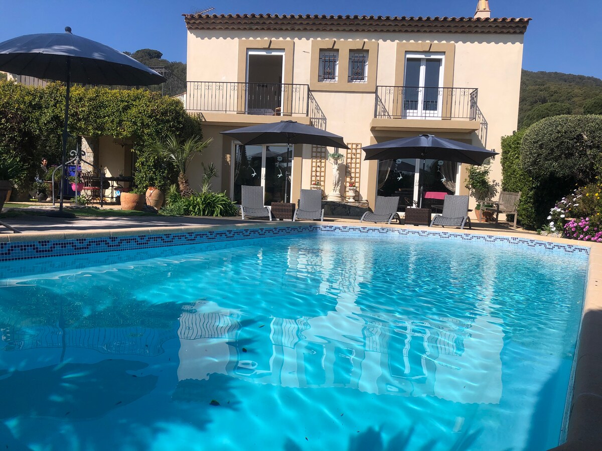 LES BASTIDES DE GRIMAUD. Sainte Maxime və Saint Tropez arasında 16 villadan ibarət şəxsi əmlakda 10 nəfərlik gözəl son villa (4 yataq otağı/4 vanna otağı), çox yaxşı təchiz olunmuş, səliqəli müasir dekorasiya. Siqnalizasiya ilə təmin edilmiş, sorğu əsasında 24-27° C arasında qızdırıla bilən ayrıca hovuz (daxil olmaqla) temperaturun yüksəlməsinə təxminən 10 gün icazə verir. İstilik mayın əvvəlindən iyunun sonlarına və sentyabrın əvvəlindən oktyabrın sonlarına qədər mövcuddur.
