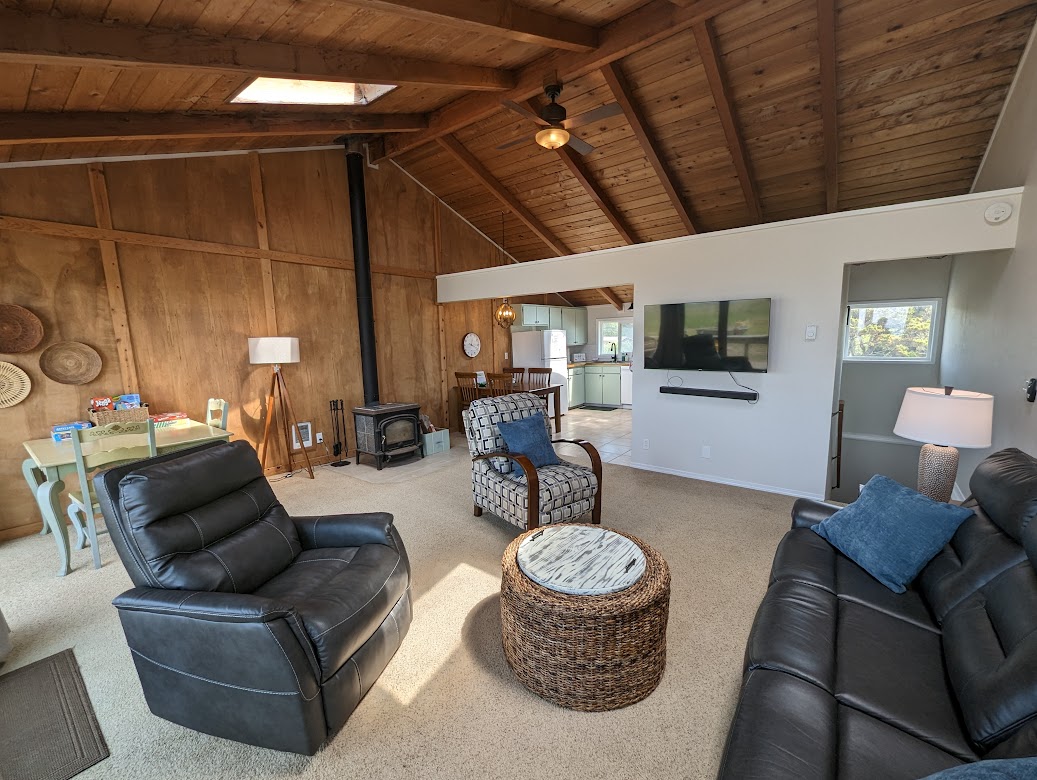 This unique getaway cabin has a style that is all its own! When you arrive, you will be greeted by the warmth cedar wood, touchable textures, and architectural angles throughout the space. This charming two bedroom and one bathroom 60's inspired chalet styled cabin has a lot of personality, and an open floor plan. The space can sleep upto 4 adults, and is in a quiet neighborhood location less than 5 minutes from the amenities of Westport. Adult (over 18 years old) guests are preferred.