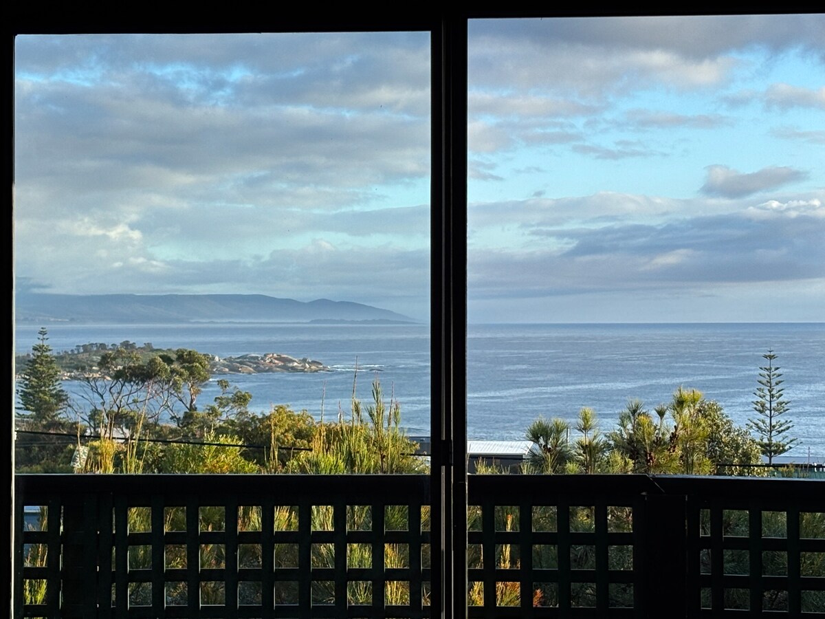 Relax at this tranquil getaway and take in the amazing view of the ocean from the deck. Leave the blinds open and wake up to a beautiful ocean sunrise. By day, you will see seals lazing on the rocks and may catch a glimpse of whales on their migration. At night, quietly watch for the penguins walking up to their burrows. Shops, restaurants, beaches and boat ramp are all within 15 min walk. Fabulous wineries, great bush walks, National Parks and Wine Glass Bay are within 30 min by car.