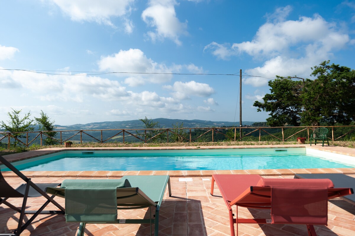 Nəfəskəsici mənzərəsi olan Toskana Villasında böyük və füsunkar üst mərtəbə mənzil! Montepulçiano, Pienza, Siena şəhərlərinə baş çəkin, kənd yerlərini, üzüm bağlarını və isti bulaqları araşdırın, piyada və ya elektrik velosipedlə gəzintiyə çıxın, gəzin və ya avtomobil sürün! Yüksək keyfiyyətli çarpayıları və hamam otağı olan iki geniş lüks nömrə. Pəncərələri divarla əhatələnmiş qonaq otağı, rahat divanlar, öz istifadə üçün peşəkar mətbəx. Şərab zavoduna ziyarət və dequstasiya, aşpazlıq dərsləri və şəxsi şam yeməkləri təyin edə bilərik. Yaşıl təpə ilə üzbəüz YENİ cakuzi! Yerli Ev Sahibinizlə yerli kimi TəcrübəToskana!
