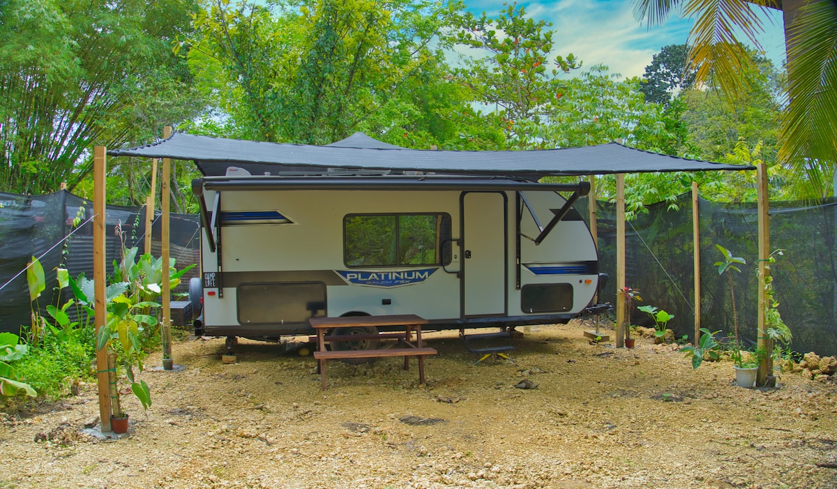 Our cozy RV camper is a comfortable, budget-friendly option offering privacy and your own kitchen and space. Fully equipped with AC, hot-water shower, full kitchen, Wi-Fi, and two sleeping areas. Just a 1-minute walk to a swimmable beach and a short bike or taxi ride to town with shops, restaurants, and bars. Ideal for 2–3 adults or a family of 4 (a 4th adult fits but is tight). High-quality 8” Short Queen bed. Covered outdoor space with picnic table, ideal for dining and remote work.