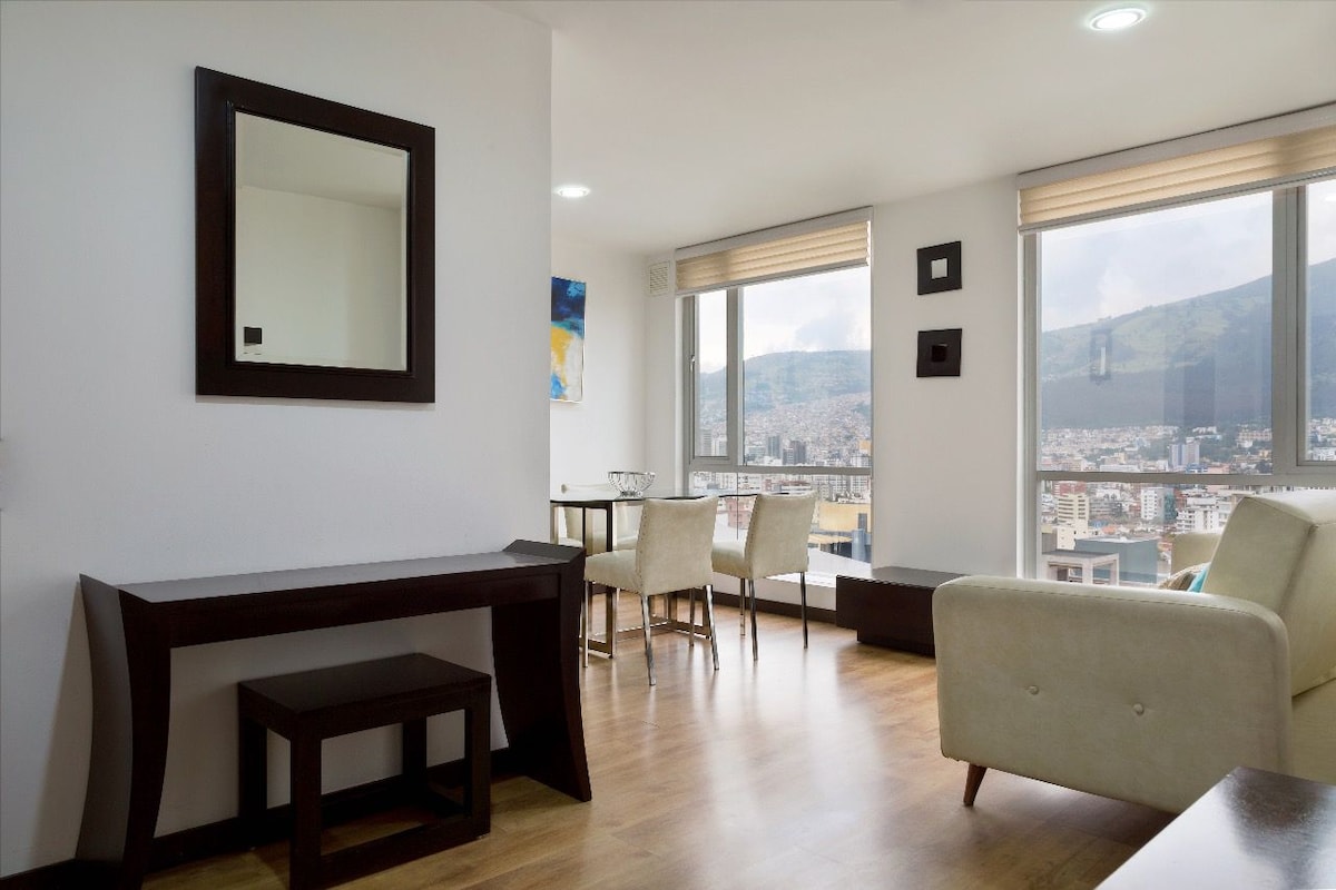 Rating 4.99 ⭐⭐⭐⭐ - Top 5 best-rated in all of Quito. Electric generator ⚡ and we issue invoices!! Very cozy 😊, bright, fully equipped, and super well located. You won’t share it with anyone else! Located in the north-central area of Quito, 1 block from La Carolina Park, El Jardín Mall 🛍️, the Chamber of Commerce, and the Metro 🚇. Close to Quicentro and CCI Mall. Banks 🏦 and restaurants on a quiet street. Flexible check-in ⏰. Gym 🏋️, co-working 💻, game room 🎲, BBQ 🍖& jacuzzi 🛁
