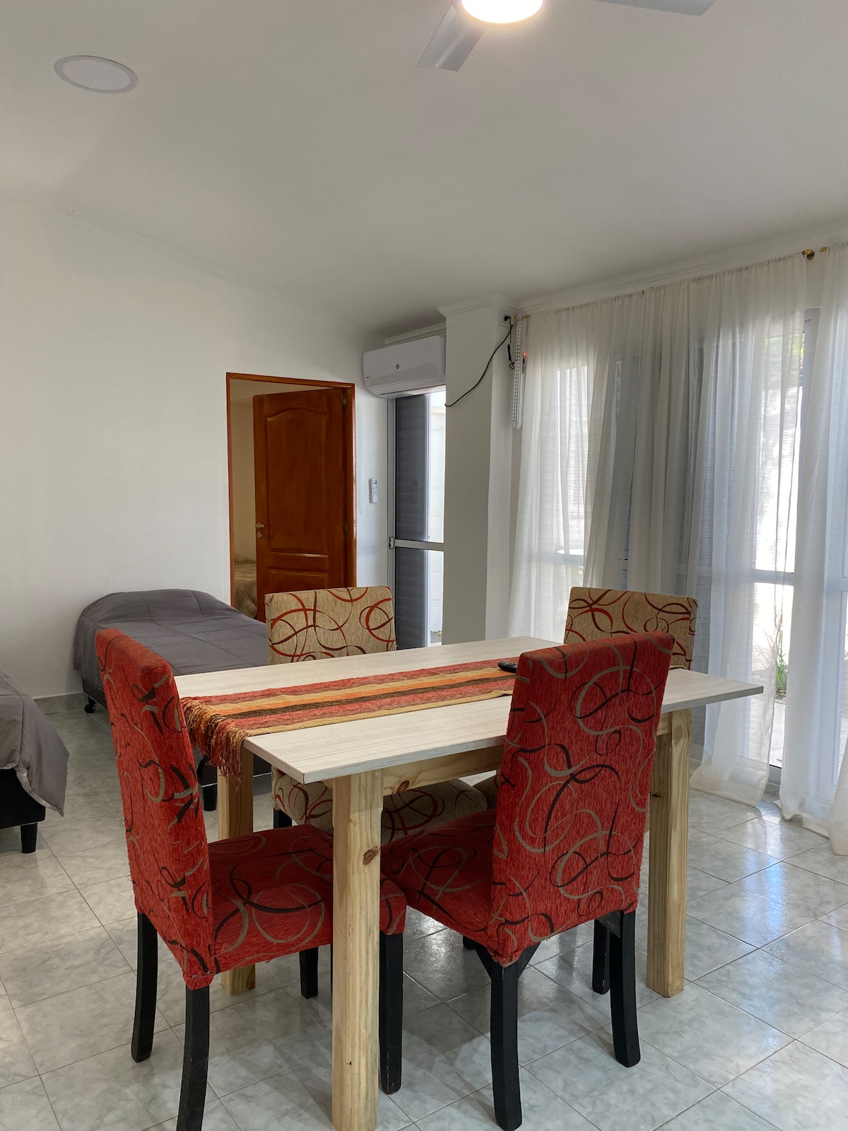 Este luminoso departamento para 4-6 personas ofrece una cocina totalmente equipada con anafe eléctrico, microondas, vajilla completa y pava eléctrica. Cuenta con dos habitaciones, una de ellas integrada al living-cocina. El baño tiene ducha e inodoro separados, ideal para familias. Además, dispone de aire acondicionado, WiFi de 300 megas, cochera cerrada y cámaras de vigilancia 24/7. Ubicado a solo 3 cuadras de la plaza principal, en una zona céntrica y segura.