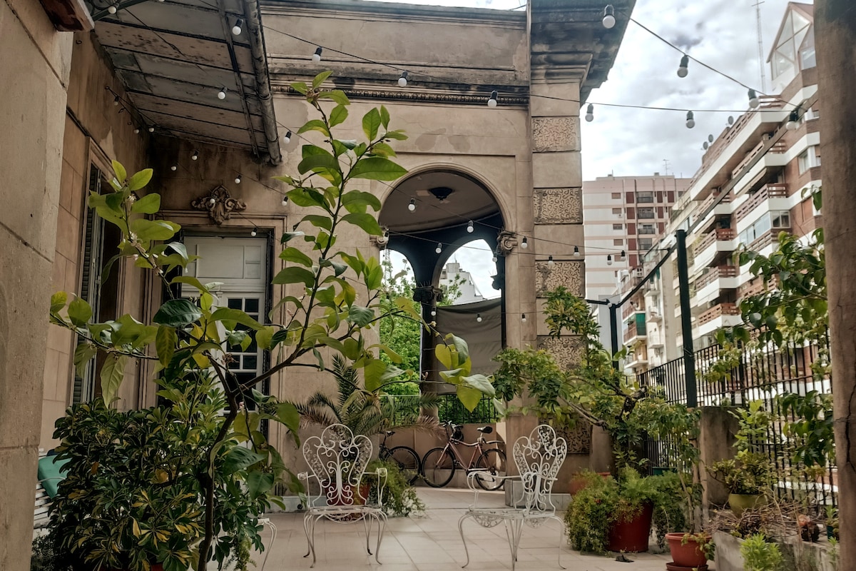 El Alojamiento es una Planta Baja amplia (100 m2) y silenciosa, con un hermoso jardin al fondo. Muy bien equipada y con detalles de elegancia y estilo. Ideal para una o dos parejas. Esta situada en el centro geografico de la ciudad de Bs As. Zona muy bien provista de todo tipo de mercados de comestibles y tiendas. Y a metros del historico y centenario "Mercado del Progreso". Cuenta con acceso a todos los puntos de la Ciudad y Provincia a traves de paradas de autobuses, Lineas de Metro y Tren.