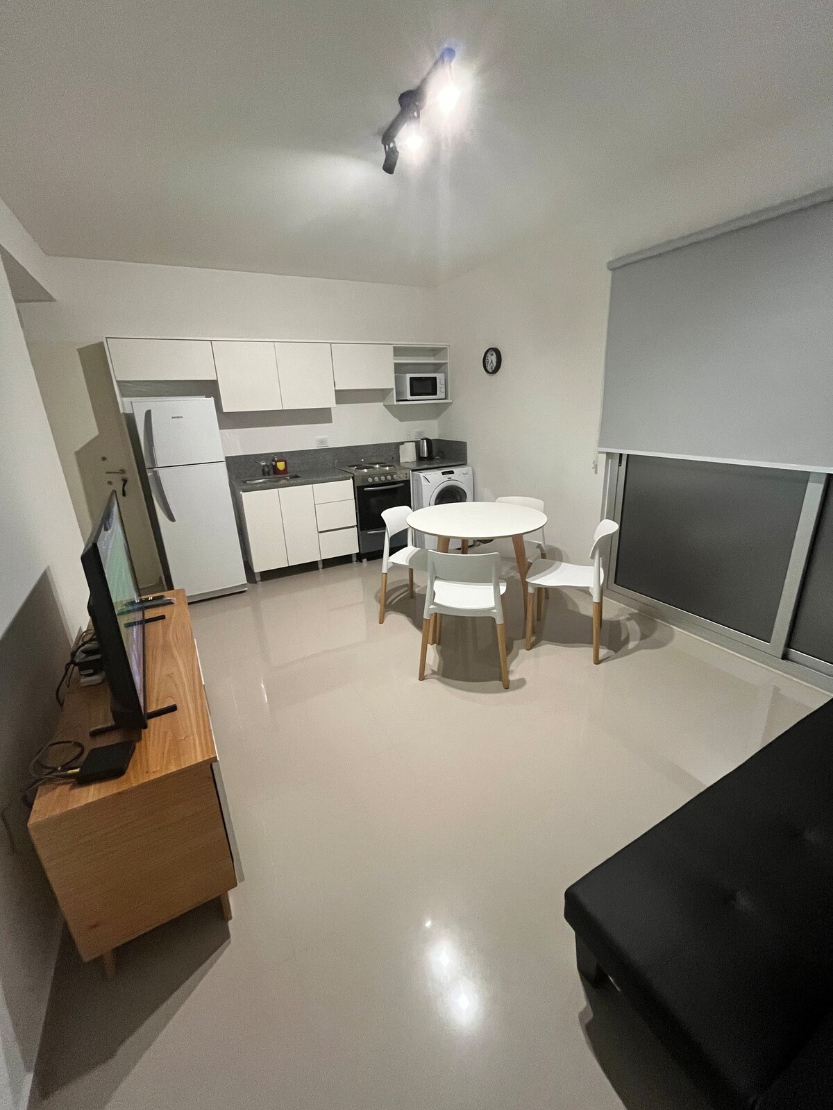 Amplio y moderno departamento de un ambiente con cocina y baño completo, balcón a la calle, luminoso ubicado en Almagro. Importante: no hay oscuridad total. Equipado para dos adultos en cama doble. No alojamos a menores ni mascotas, ya que no contamos con camas individuales. Smart TV, conexión a internet. Todos los servicios son eléctricos. La tarifa incluye sábanas y toallas. Consultar por horarios de entrada y salida flexibles de acuerdo a las reservas que tengamos.