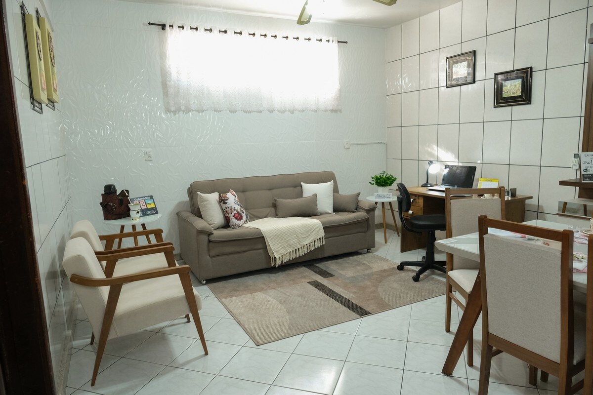 Conforto e privacidade. Banheiro privativo reformado. Local tranquilo para descansar há apenas 5 minutos do centro da cidade. Disponibilizamos máquina de lavar roupas, sala com TV Smart e Sky, além de cozinha equipada com torradeira, chaleira elétrica, microondas, fogão e todos os utensílios para livre utilização. A união de uma casa espaçosa e aconchegante com a proximidade da área central. Observação: O uso da piscina não está incluso e não é permitido.