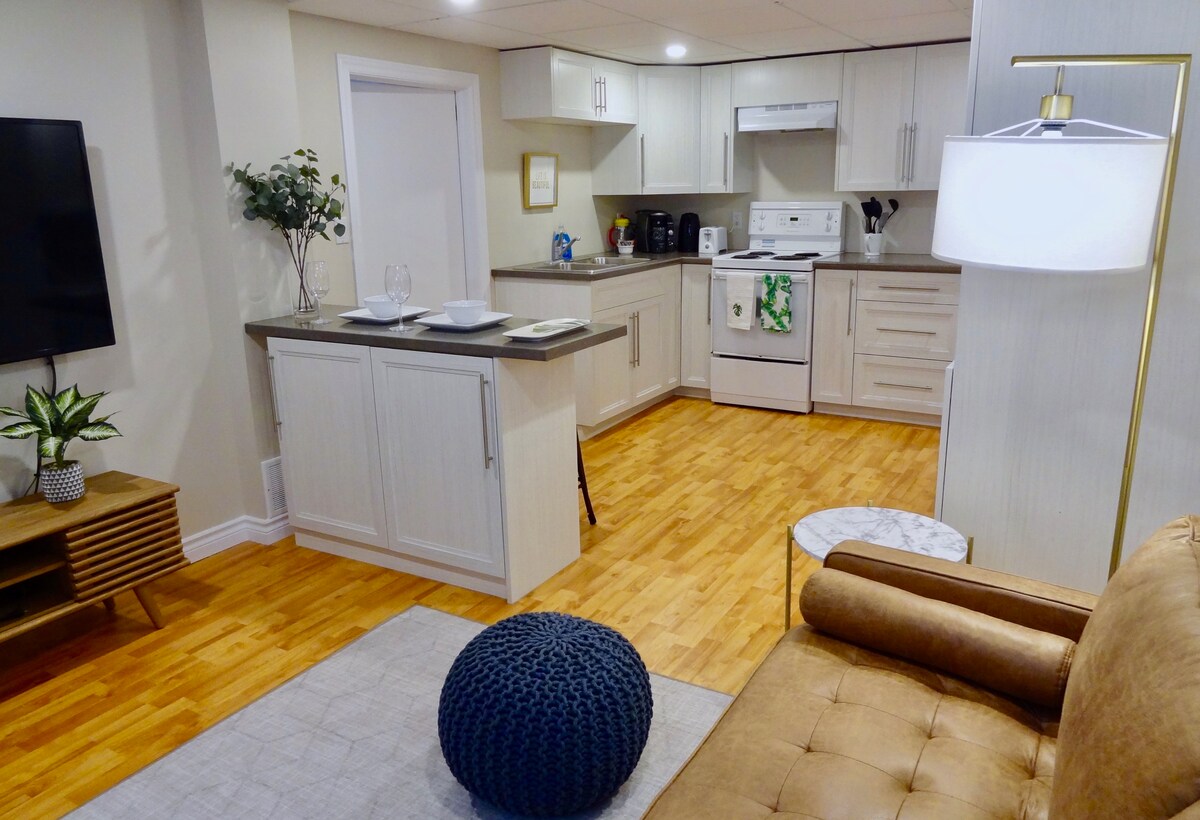 This stylish and cozy 1 bedroom basement apartment is your home away from home! Perfect for monthly stays: -Luxurious QUEEN bed with 2-inch memory foam topper and down alternative comforter -SIT-STAND DESK with ergonomic office chair! -Dedicated washer/dryer included -Fully equipped kitchen with oven/stove, full sized fridge, microwave, and double sink -Walk-in closet -Free parking space -55-inch 4K Smart TV with COMPLIMENTARY NETFLIX access included! -Enjoy fresh air on your comfy patio
