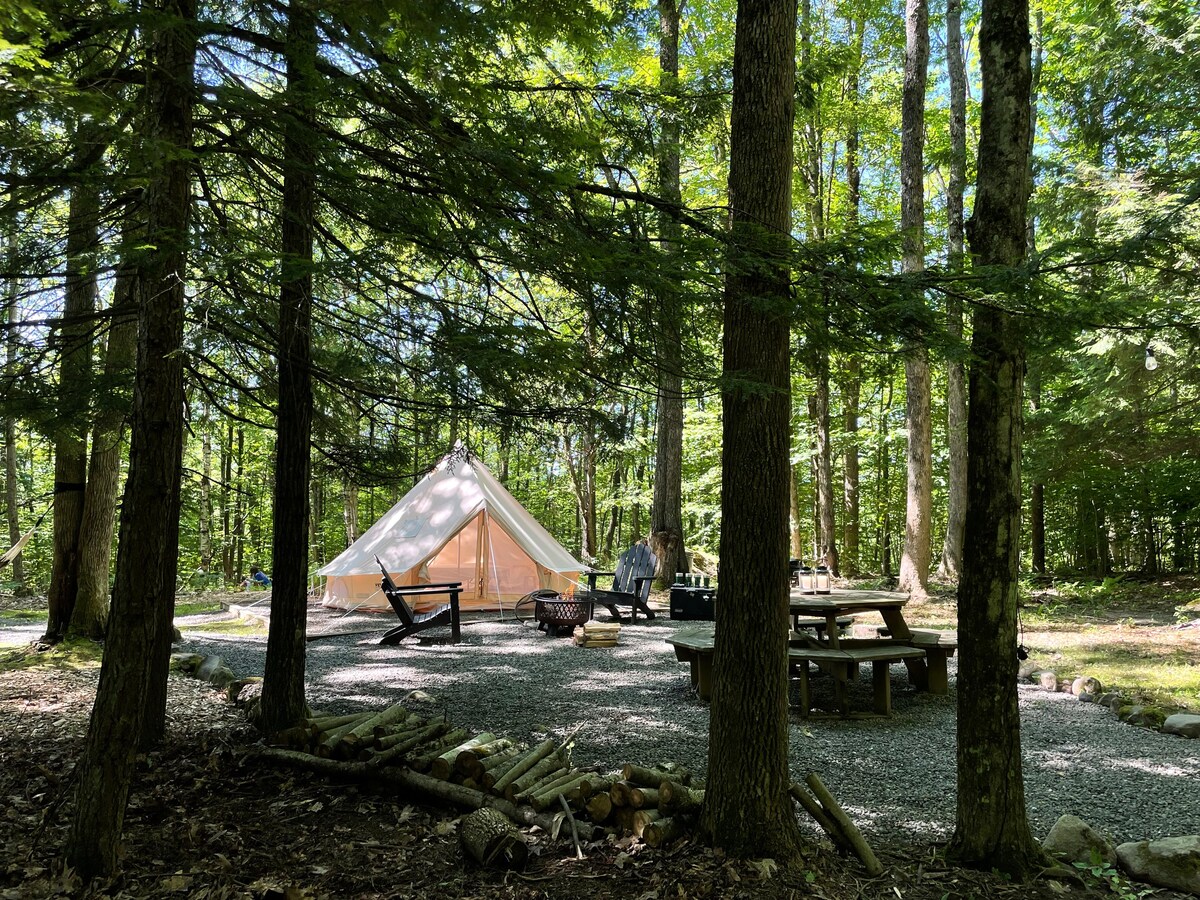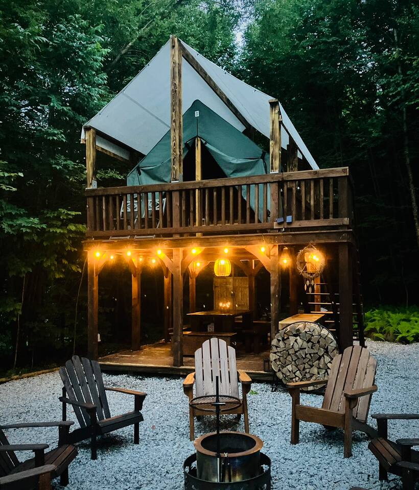 Dağ mənzərəli yabanı çəmənliyin kənarında yerləşən bu gözəl mebelli qlempinq çadırında 180-22 sm-lik su çarpayısı, divan və xüsusi göyərtə var. Hər bir çadırda balaca mətbəx var. Gözəl Hamam Evi var. Odunla işləyən pizzadan (əksər hallarda yayda deyil, bütün gecələr) və taxta cakuzimizdən (ayrıca təcrübə üçün 25 $) zövq alın. 40 hektar çəmənlik, meşə, gölməçə, axın və cığırlardan zövq alın. Aşağıda Hudson çayında bir gecəlik tonqallar, ulduzlara baxma, yaxınlıqdakı göl və raftinq.