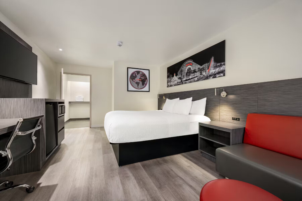 Stay just steps from Disneyland® Resort at Ramada by Wyndham Anaheim Convention Center, ideally located for families and theme park visitors. This king room offers modern comfort and relaxation after a full day at the parks or the Anaheim Convention Center. Guests can enjoy a complimentary breakfast before heading out for more adventures.