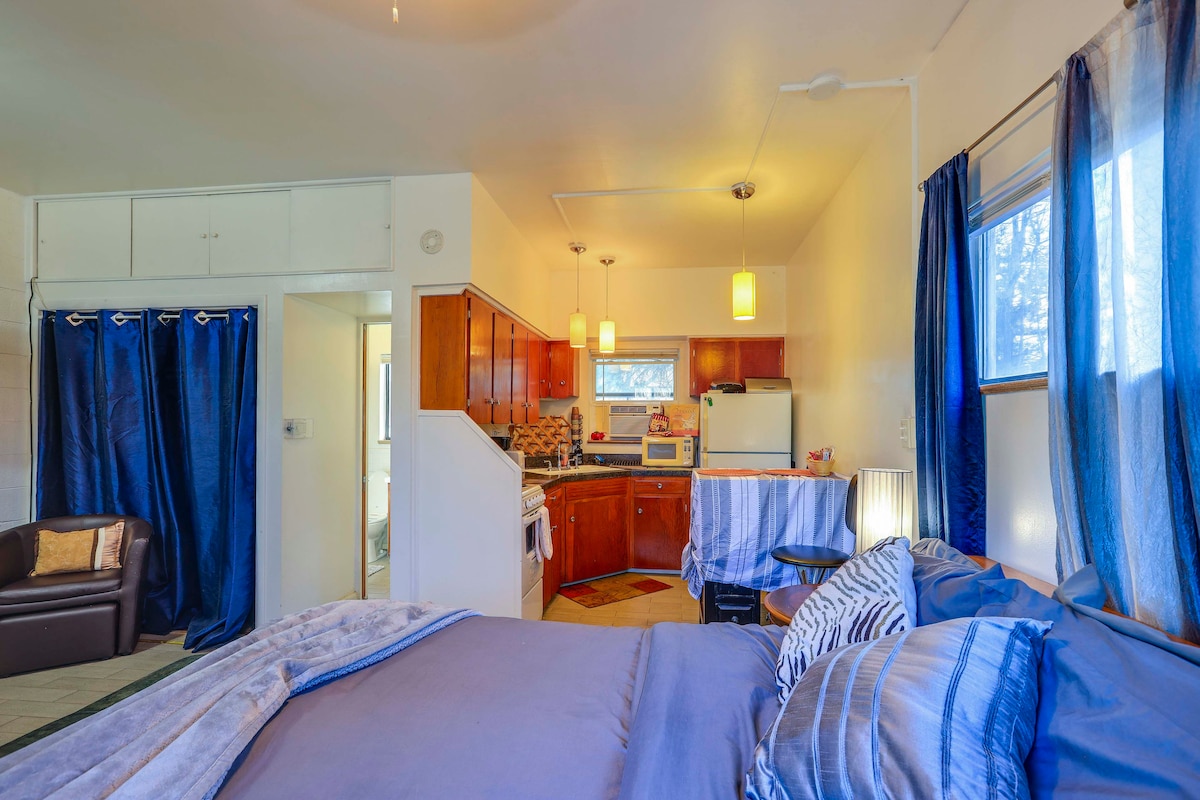 Bu sakit, dəbli məkanda dincəlin və dincəlin. 5 hektar ərazini yamyaşıl oazisə daxil edin. Studiyada yemək çətiri, örtülü masa, çoxlu oturma və istirahət zonası olan günəşli qarşılama göyərtəsi var. Qranit dəzgahlar, üzən rəflər və tonlarla təbii işıq da daxil olmaqla tam mətbəxli yeni qurulmuş studiya. Rahat qonaq otağı sahəsində orta səviyyəli müasir dəri divan və işləmək üçün üstü liftli qəhvə masası var. Pilləkən nərdivanını 2 kraliça çarpayısı olan loft bunkbed sahəsinə dırmaşın.