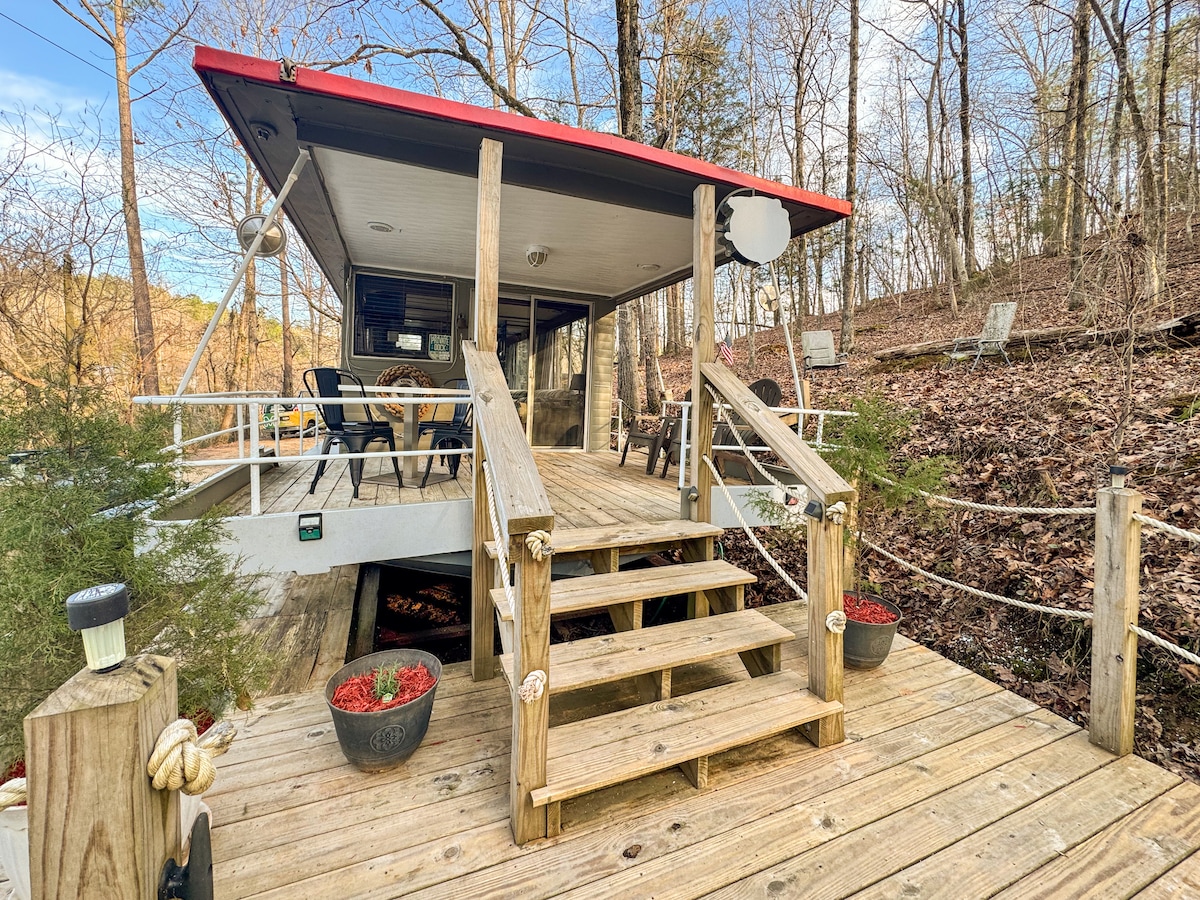 ESCAPE AND UNWIND at Perch! Sleep elevated in the trees at this lakefront treehouse located on Lake Mitchell. This very unique stay features a main house with a full kitchen, a separate bedroom accessed by a covered walkway, and a second floor porch which opens up for a fully immersed view of the sunset. Enjoy a large living space under the house with a TV, bed swing, and outdoor double shower. Hang out on your private dock and pass the day away on "Lake Time." You are sure to leave rested!