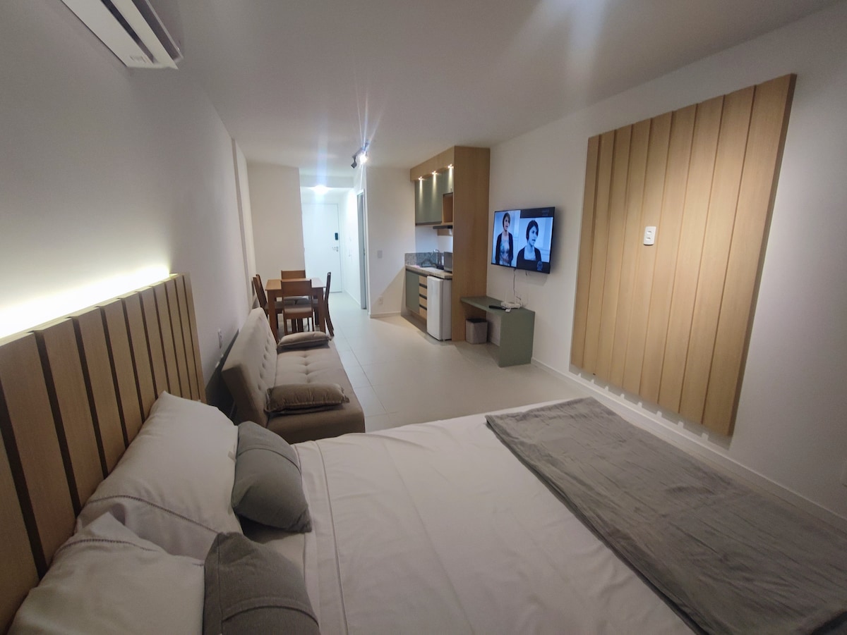 Diqqətlə oxuyun: Não fazemos desconto, por favor NÃO INSISTA Yeni və memar dizaynlı studiya dupleksi: keyfiyyətli döşəkağıları olan bir nəfərlik çarpayı, divan çarpayı ( 1 nəfərlik) və təchiz edilmiş mətbəx. Masa və stulları olan terras. Qonaq otağı və kommunal yemək otağı olan lüks bina, Wi-Fi-ı olan Ev Ofisi terrası, 4 paltaryuyan/quruducu maşını olan camaşırxana və kommunal hovuzu olan Dam Üstü və Krist Redentorun mənzərəsi