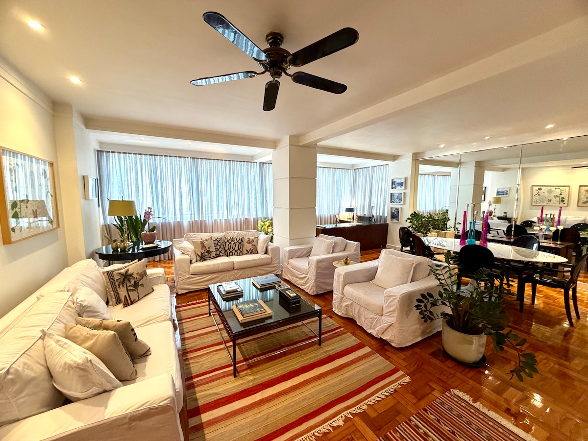Enjoy a stunning and unique view of both the ocean and the mountain in a centrally located 2 bedroom renovated apartment in Leme, Copacabana ideal for families and couples. The apartment is cozy and has everything you need to make you feel at home. A very spacious and stylishly decorated living room, and a fully equipped apartment. One bedroom has a queen bed, the second bedroom has 2 single beds, and there are 2 more mattress/futons that can be placed in the living room if needed.