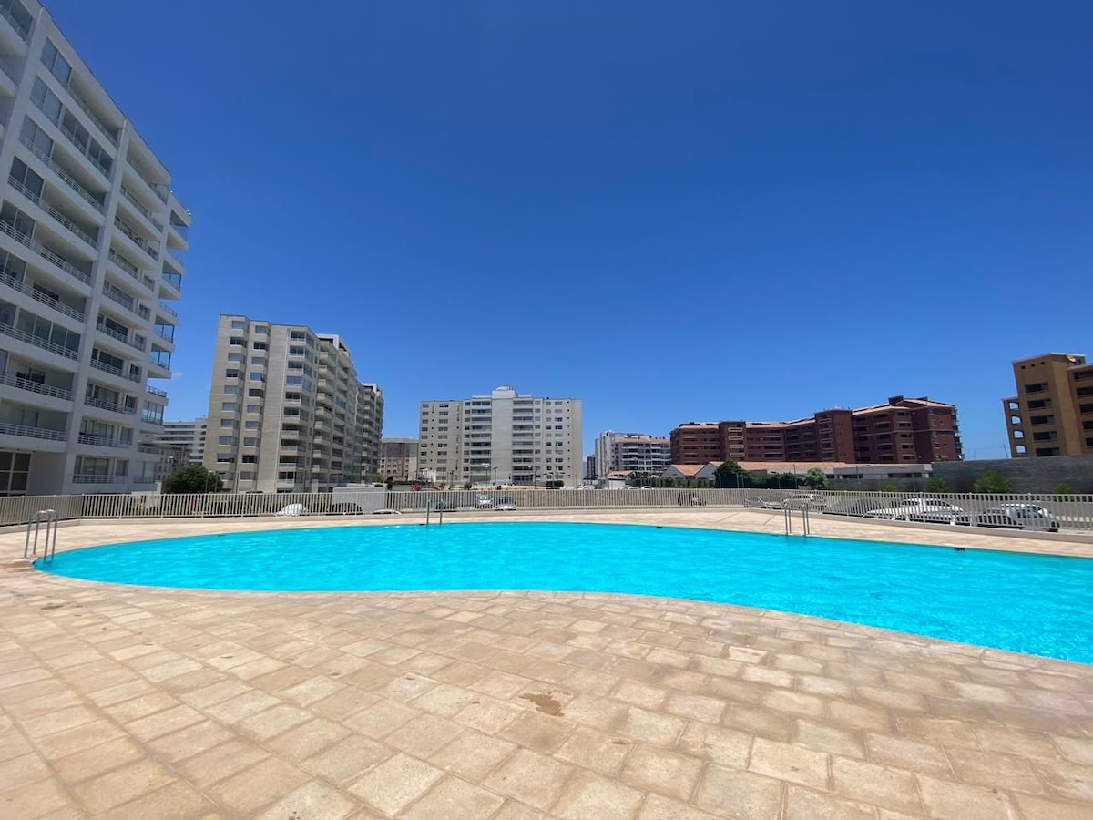 Departamento en primera línea en Avenida del Mar, con espectacular vista y una ubicación ideal. Cercano a restaurantes, cafeterías, y casino Enjoy. El departamento ofrece un ambiente acogedor, cómodo, e ideal para viajes cualquier época del año. Totalmente equipado, cuenta con wifi, TV, sábanas, toallas, horno, microondas, cafetera, parrilla eléctrica y todo lo necesario para una experiencia práctica y agradable. Además, de contar con piscina, perfecta para relajarse y aprovechar al máximo.