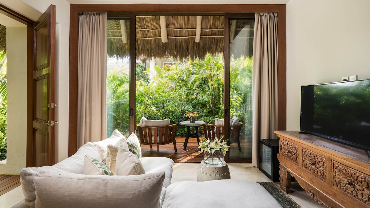 With the ocean in view, this dynamic villa is the perfect sunny escape for those who appreciate their privacy. On the back patio, lush greenery and mature palm trees create a lagoon-like atmosphere around the pool. Inside, natural wood and stone meet sleek architecture and pops of local color to create a relaxing space to call home. Copyright © Luxury Retreats. All rights reserved.